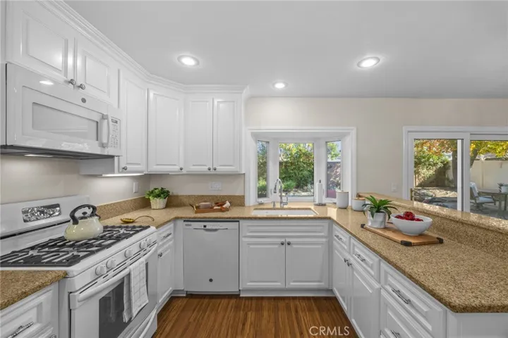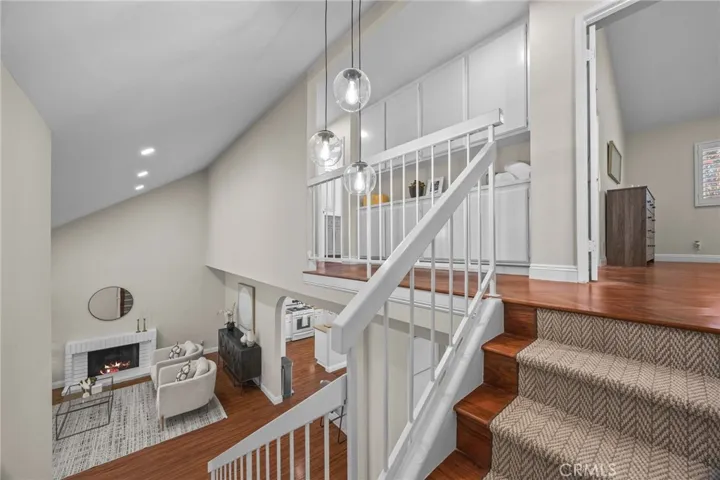 Step inside to be greeted by fresh new interior paint, dramatic vaulted ceilings, and well-balanced natural light enhanced by double-paned windows and new recessed lighting. Elegant new lighting upgrades include a designer dining chandelier, a designer stairway chandelier, and a new entry ceiling light, all adding sophistication and a refined ambiance throughout the home. The spacious formal living room with its cozy fireplace creates an inviting atmosphere, while the separate family room offers flexibility for everyday living and entertaining. The refreshed white kitchen features generous cabinetry, a charming bay window overlooking the backyard, and seamless flow to the dining and living areas.