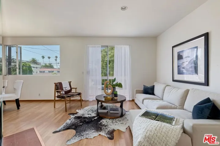 This single-level contemporary unit in a prime area North of Wilshire features two bedrooms and two bathrooms. It boasts high ceilings, a wood-burning fireplace, and engineered hardwood flooring throughout. The living room features a wet bar and a balcony overlooking California Avenue. The bright kitchen offers a breakfast area, an in-unit washer-dryer, and a pantry for additional storage. The primary suite features a balcony, large windows, a walk-in closet, and a private bathroom. The building consists of only five units, with two units per floor. Parking is conveniently side-by-side, and extra storage is available. This property is ideally situated near a variety of shops and restaurants along Wilshire, and is just a short stroll from Reed Park and the Third Street Promenade.