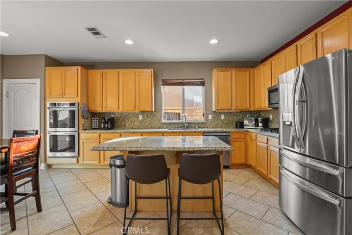 Step inside to a bright and welcoming interior featuring a spacious living room, open dining area, elegant tile flooring, and a custom cherry wood built-in that adds warmth and character. The gourmet kitchen features granite countertops, stainless steel appliances, double ovens, a center island with breakfast bar, a cozy dining nook, and abundant cabinetry. The kitchen flows seamlessly into the family room, where custom built-ins and a stone fireplace create an inviting atmosphere.