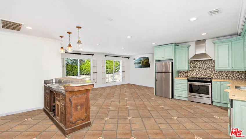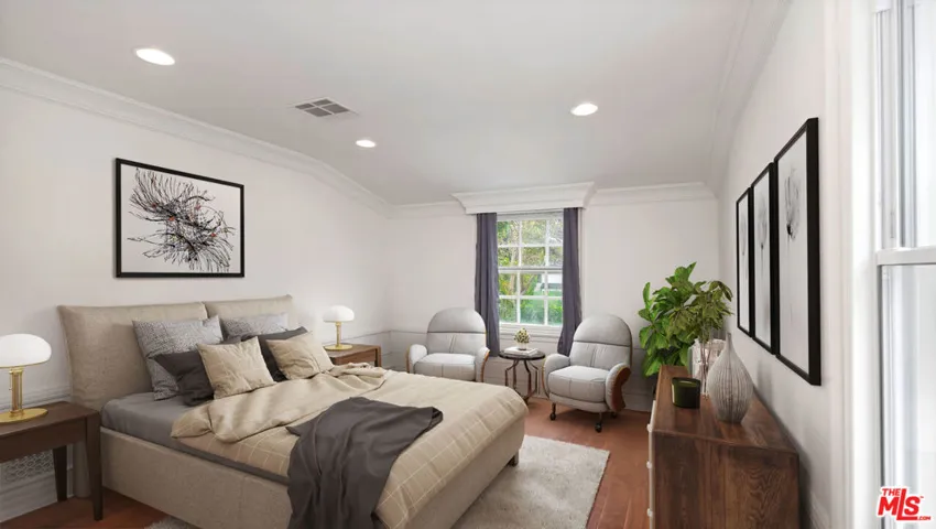 An extraordinary opportunity to live in a Beverly Hills Flats estate, perfectly situated just moments from the iconic Waldorf Astoria and Rodeo Drive. Set on a generous flat lot, this private property offers an impressive combination of scale, quality, and comfort across a main residence and a fully equipped back house totaling 7 bedrooms and 6.5 baths. Step inside the two story foyer and experience timeless elegance highlighted by mahogany doors and windows, hardwood flooring, and beautifully crafted architectural details, with sunlight pouring through the windows to create a bright and inviting ambiance throughout the home. The kitchen opens directly to a warm and spacious living area anchored by a classic fireplace, ideal for everyday enjoyment or hosting guests. Upstairs, you will find four ensuite bedrooms including a refined primary suite featuring a gorgeous fireplace, a large private balcony overlooking the lush grounds, dual walk in closets, and a spa inspired bathroom with dual vanities, a soaking tub, and an oversized shower. The lower level is thoughtfully designed for entertainment and versatility, offering a generous media and lounge area, a dedicated office, one bedroom, a full bathroom, a powder room, and abundant storage. The backyard feels like a resort, complete with a pool and spa, beautifully landscaped gardens, and a detached guest house with two bedrooms, two baths, its own kitchen, and a built in bar, perfect for guests, long term stays, creative use, or staff accommodations. Mature landscaping surrounds the property, creating a serene setting ideal for relaxation and entertaining.