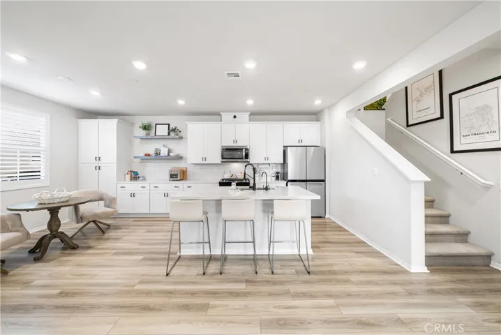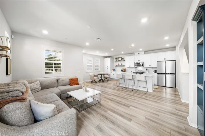 Welcome to your dream home in the heart of Rancho Mission Viejo! This stunning 3-bedroom condominium offers a perfect blend of style, comfort, and modern amenities. Step inside to discover an inviting living area where natural light pours in, enhancing the spacious layout. The open-concept kitchen, dining, and family room create an atmosphere perfect for gatherings and entertaining. Embrace your inner chef in the beautifully appointed kitchen featuring custom-built cabinetry, elegant quartz countertops, stainless steel appliances, and bar seating for three, ideal for casual meals or morning coffee. The living room boasts a custom-built entertainment center with a cozy fireplace, perfect for relaxing evenings or hosting game nights. Enjoy the large modern side yard, designed for both entertaining and providing a safe haven for pets. String lights create a magical ambiance for outdoor gatherings.