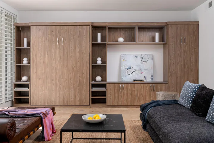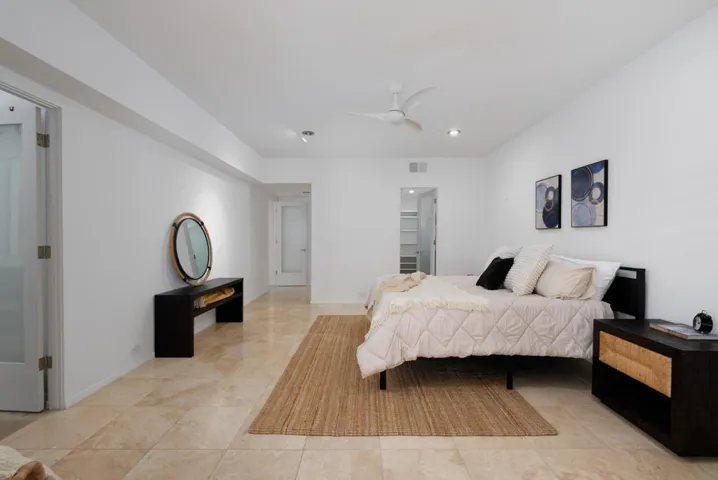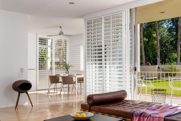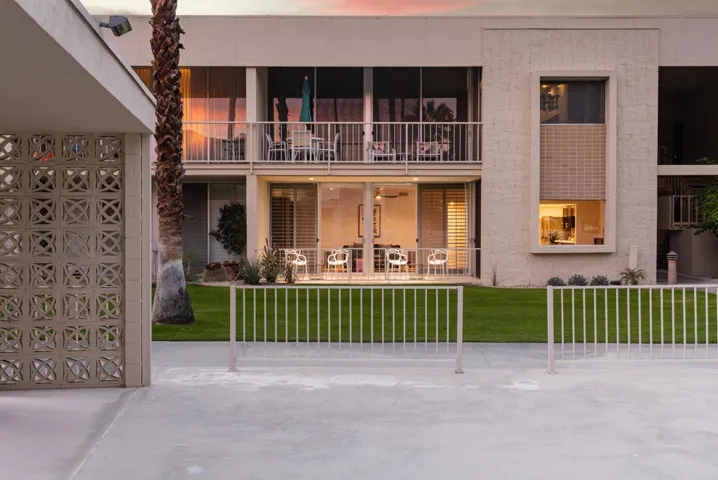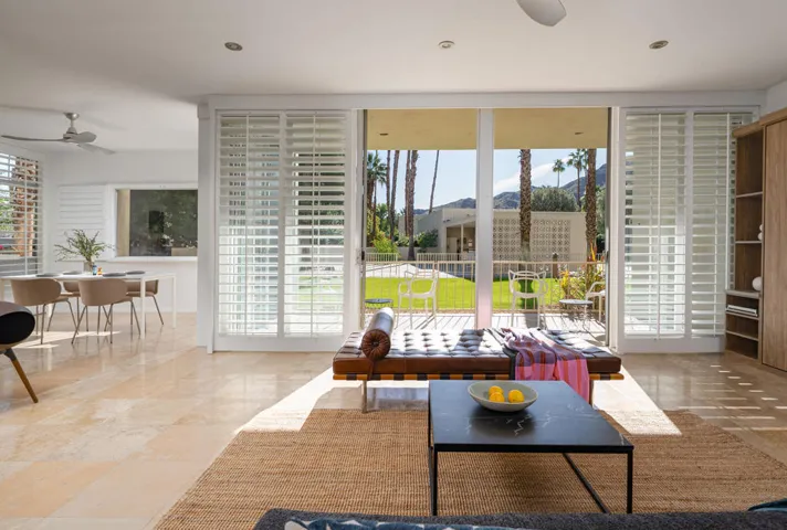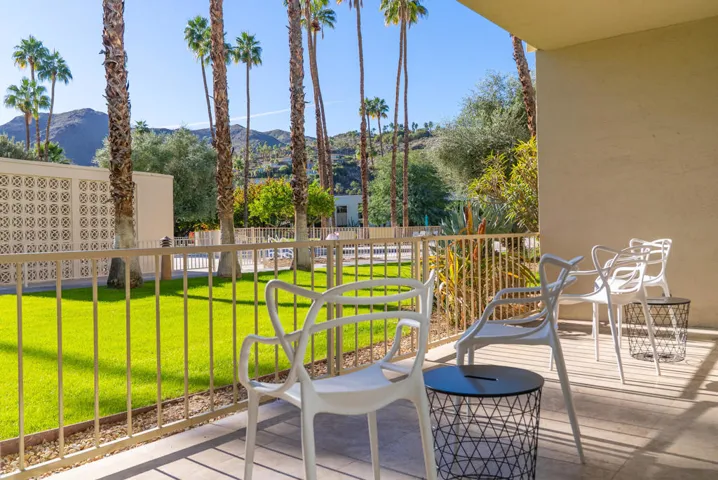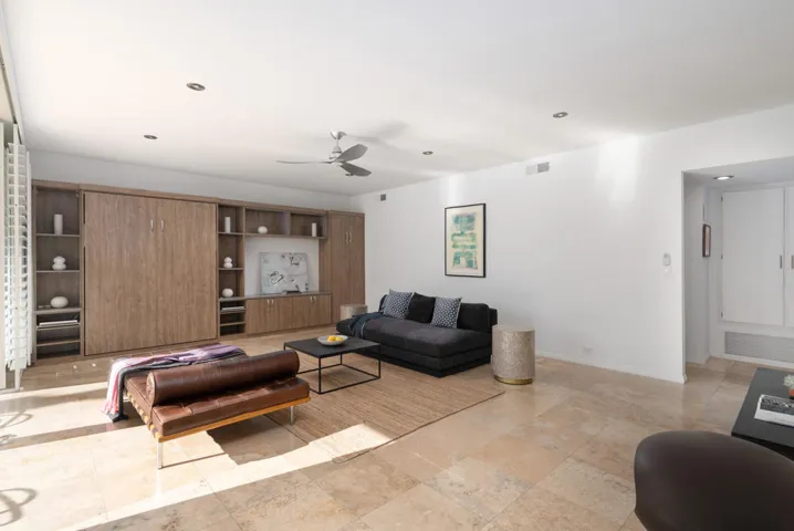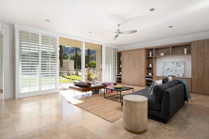 Ease into resort living in this spacious late-century modern one bedroom + den, two bath condominium, designed by renowned architect Richard Harrison. Located within the much desired Seven Lakes Golf & Country Club, this south facing unit offers views of iconic Southridge from its leisure terrace. Inside, the expansive floor plan showcases clean lines, travertine tile flooring throughout, abundant natural light and versatile living and dining spaces. A custom Murphy bed finished in beautiful wood cabinetry allows for an easy guest room. The contemporary kitchen offers ample quartz counters, gleaming stainless appliances and abundant storage. Your generously sized primary suite is complemented by a large walk in closet, a huge bathroom with built in cabinets and a walk in shower, while the second full bathroom is tucked privately at the rear of the home. A separate den makes a perfect work from home space or Zen room. Then step outside to your private rear courtyard, ideal for entertaining, dining al fresco, or enjoying tranquil mornings surrounded by lush surroundings. A private one-car carport with additional storage, and a ChargePoint Level 2 EV charger are included for your convenience. Other upgrades include new plumbing with a new main water line and updated HVAC. Out your door, the largest of 7 Lakes’ 15 tranquil pools is just steps away. Past the 24-hour guarded gate, ‘The Gem of the Desert’ offers a unique elevated lifestyle with its Ted Robinson-designed 18-hole executive golf course and the lively William Cody designed clubhouse waiting to welcome you to its formal dining room, casual cocktail lounge, and a terrace overlooking the waterfall-fountain. Welcome home!
