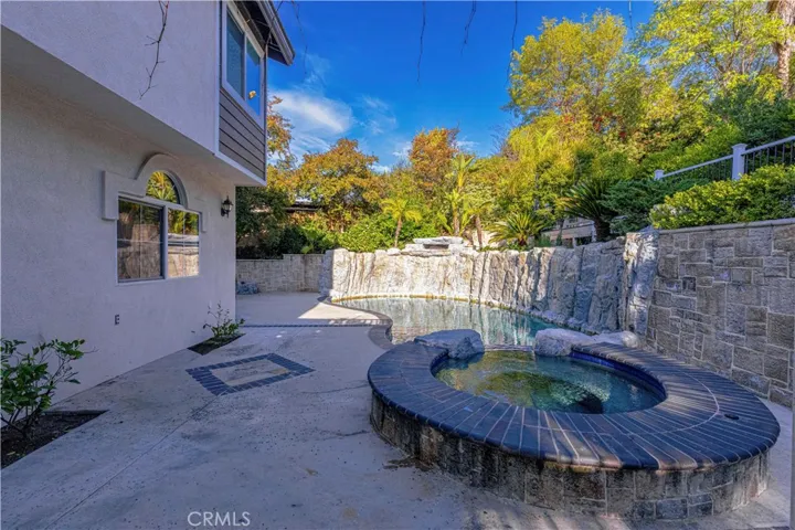 The backyard provides a private, resort-like setting with a custom rock-scaped pool, elevated spa, waterfall feature, tropical landscaping, large hardscaped patio, and a pergola perfect for outdoor dining and entertaining.