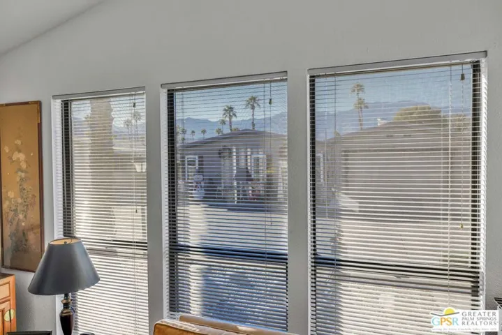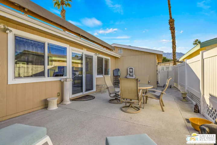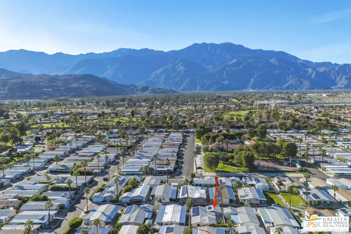 Location + Garage + Solar = A fantastic opportunity at The Canyon, one of the area’s most desirable mobile home communities. This spacious 2 Bed / 2 Bath home with a bonus sunroom offers 1,558 sq. ft. of comfortable, well-maintained living space. With drywall throughout, recent updates include: new water heater, garage door, and garage insulation (2024) – new kitchen appliances; gas range, refrigerator, microwave, and dishwasher (2020) – new AC coil and furnace (2021) – new AC/heater mini-split in sunroom, new electrical panel, and patio misting system (2019). From the cozy living room, take in the mountain views and gorgeous desert sunsets. The kitchen features granite tile countertops and custom cabinetry. The large primary bedroom with ensuite bath creates a private retreat within the home. The primary and guest baths both offer granite countertops and custom cabinetry, with the primary bath featuring dual sinks. The bonus sunroom offers versatile possibilities and features a gas fireplace. Energy efficiency is a highlight with 20 leased solar panels installed in 2020 by Sunrun, and a vented evaporative cooler, helping keep energy bills low. Enjoy the convenience of the laundry room adjacent to the attached two-car garage. Outside, the private, fenced backyard includes an electric patio awning and two mature citrus trees. Community amenities at The Canyon include two sparkling heated pools and spas, tennis & pickleball courts, a welcoming clubhouse with library/card room, billiard/game room, fitness room, crafts room, indoor shuffleboard, and a beautiful multi-function room with a stage and professional-style kitchen, ideal for events. This home is conveniently located on a quiet street, just one block away from the clubhouse. The Canyon is a gated, well-maintained 55+ community. Buyers must obtain park approval, which requires a minimum 750 credit score and proof of income three times the monthly space rent of $995. One pet up to 20 lbs is permitted. Buyers and their agents to verify current space rent and square footage. With PSP Airport, shopping, and restaurants just minutes away, this home is perfect for year-round living or as a vacation retreat.