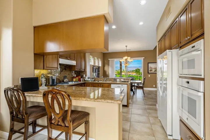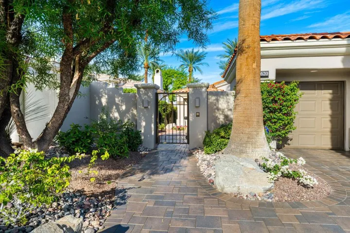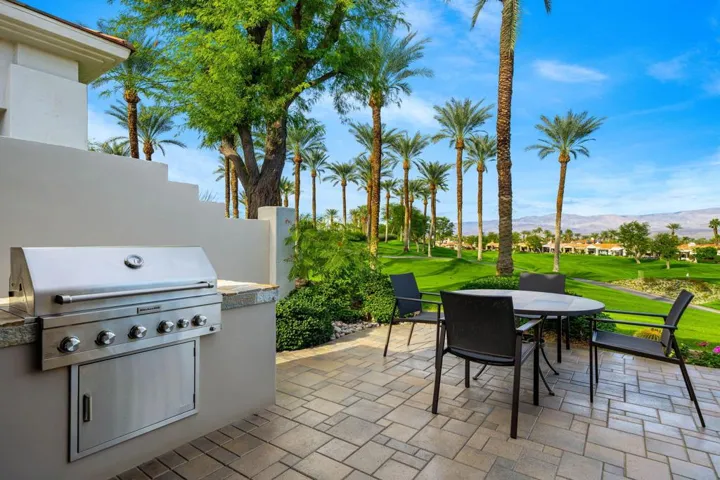 Elevated Golf & Mountain Views! Golf Membership with NO WAIT + Owned Solar! Experience the ultimate desert lifestyle in this furnished Bougainvillea 3 home, perfectly positioned above Grove #2 and #3 at Indian Ridge Country Club in Palm Desert CA. This elevated lot offers unobstructed golf and mountain views with no homes directly across–rare privacy and incredible scenery. The home makes a beautiful first impression with new pavers in the driveway, walkway, and front courtyard. The expanded elevated fairway patio features pavers, a built-in BBQ, fire feature, and multiple areas for dining, relaxing, and soaking in those panoramic views. Inside, the spacious living room includes a fireplace, bar area with wine refrigerator, and custom media built-ins. Both the living and dining rooms open to the patio for seamless indoor/outdoor entertaining. A separate sitting area/family room with built-in desk sits just off the kitchen and opens to the freshly re-designed front courtyard. The kitchen offers granite countertops and bar seating. The Primary Suite enjoys private patio access and an ensuite bath with dual vanities, large walk-in closet, shower, and separate tub. Two guest bedrooms are also ensuite, with one bathroom designed to also function as a powder room. Additional highlights include a full laundry room with storage and a 2-car plus golf cart garage with epoxy flooring and direct home access. Community pool and spa are conveniently located just a few doors away. With golf membership available without a wait, breathtaking views, owned solar, and central Indian Ridge CC location, this home offers the best of luxury desert living. Indian Ridge CC features two Arnold Palmer Signature golf courses, tennis/ pickleball facilities, a fitness center, a full-service spa, two restaurants, 38 community pools/spas & an active social calendar. Come Join the Fun!