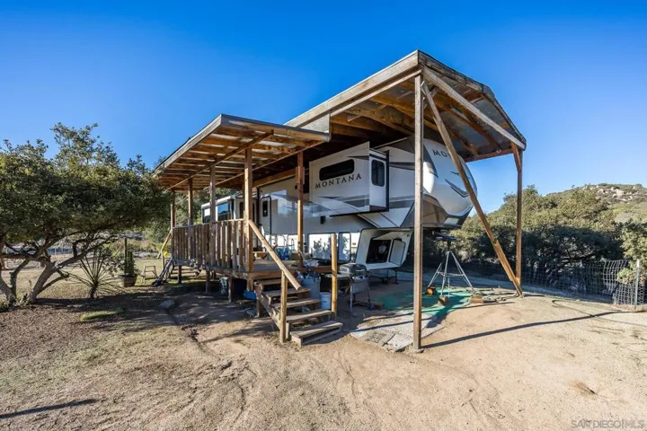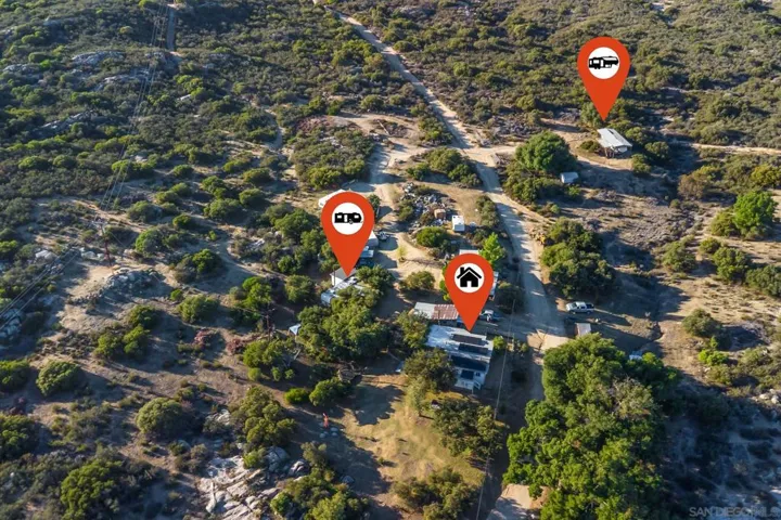Discover the ultimate rural retreat with this one-of-a-kind 120-acre property in Campo, California, offering unmatched privacy, sustainability, and versatility. This expansive estate features multiple dwellings, making it ideal for multi-family living, vacation rentals, or a peaceful off-grid lifestyle. The primary residence is an 822 sq. ft. 2-bed, 1-bath single-family home with a 580 sq. ft. wrap-around covered deck, perfect for entertaining or soaking in the breathtaking mountain and valley views. Enjoy year-round comfort with a mini-split A/C system, pellet stove, newer roof (2018), new windows, and fresh exterior paint. The home is powered by owned solar with Tesla battery backup, providing reliable and energy efficient living. Outbuildings include five storage sheds, a garage, and multiple RV setups: A 40-ft trailer with two room additions, mini-split A/C, and full hook-ups to water, electric, and septic. A 40-ft Montana fifth wheel with full utilities, private yard, and custom-built deck. Additional RV site with full hook-ups, deck, and private yard, perfect for guests or rental income. The gated property sits at the end of an unpaved road, offering the tranquility and seclusion that only vast acreage can provide. Your only traffic will be the local wildlife. Two seasonal streams flow through the land, adding natural beauty and ecological richness. An 800ft well delivers up to 22 gallons per minute of water, ensuring a steady, sustainable supply. Whether you’re seeking a private ranch, recreational retreat, or family compound, this property offers endless potential.