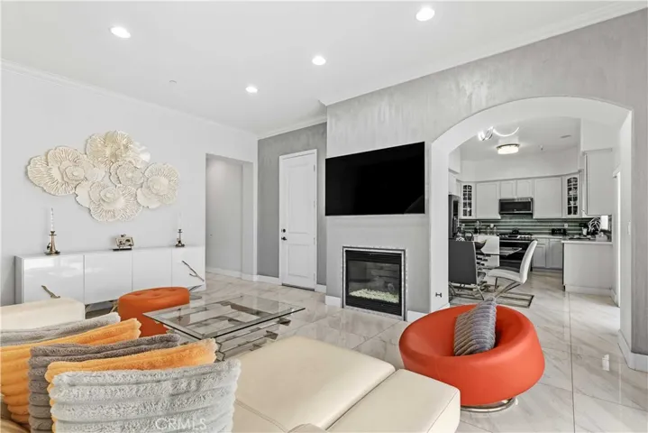 Offering approximately 2,035 sq. ft. of living space, the home features 4 bedrooms and 3 bathrooms. A contemporary front door opens to a spacious living room with a stone-accented gas fireplace. The beautifully upgraded gourmet kitchen provides a perfect space for cooking and entertaining.