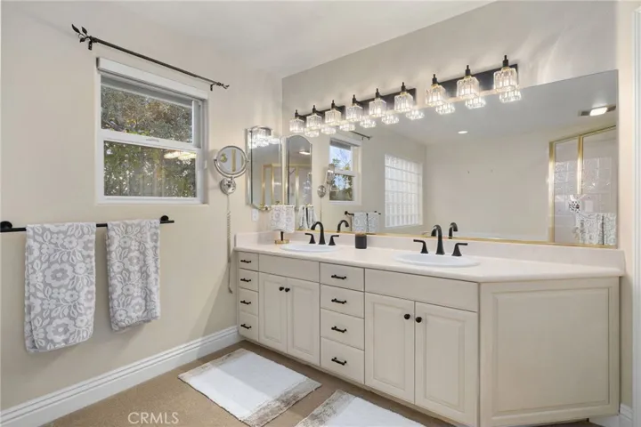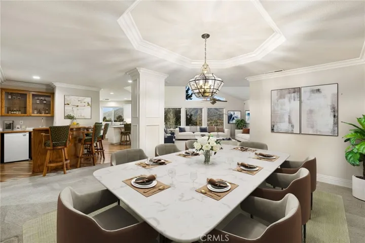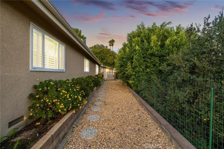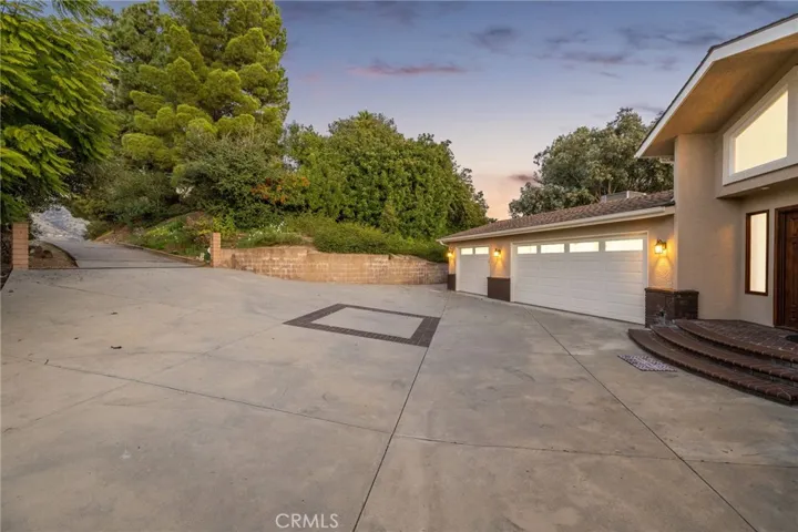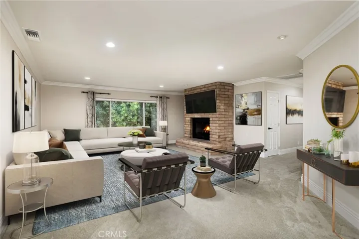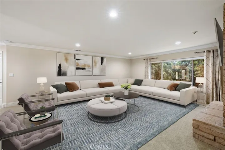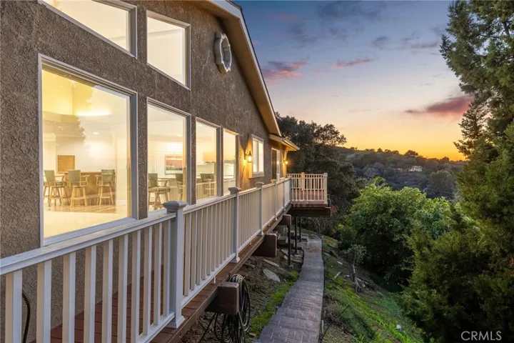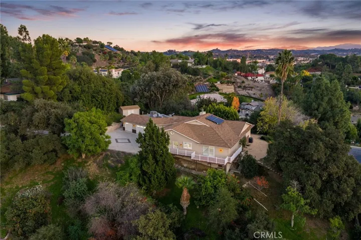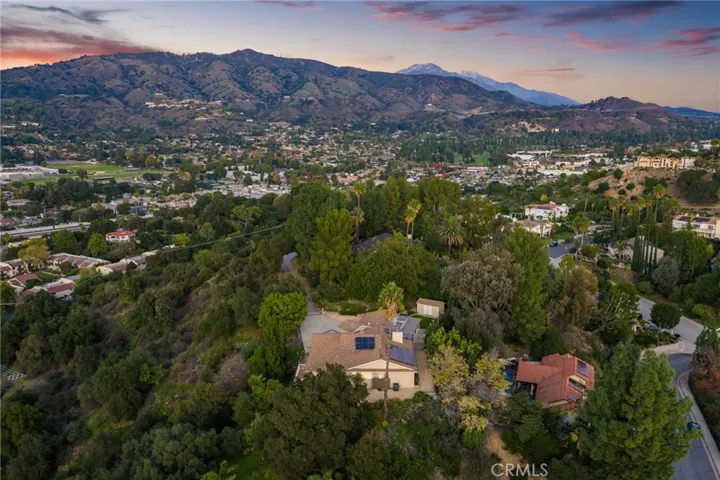 Updated Single-Story Home with Panoramic Mountain Views. Nestled on a secluded hillside lot with ultimate privacy, this beautifully updated single-story residence is accessed via a long, private driveway that opens to an extra-wide front motor court. Double wood-and-glass entry doors welcome you into a bright foyer with tile flooring that flows seamlessly into the expansive open-concept living areas. The dramatic family room showcases vaulted ceilings, a wall of picture windows framing sweeping mountain views, a bay window overlooking the front yard, and complete openness to kitchen. The kitchen features classic white shaker cabinetry, stainless steel appliances, recessed lighting, hardwood flooring, and a peninsula with casual countertop seating. Adjacent to the family room is a well appointed wet bar equipped with a sink, under-counter refrigerator, glass-front upper cabinets, and a curved radius counter perfect sitting and entertaining. The formal living room serves as a stunning focal point with its floor-to-ceiling Roman-brick fireplace and raised hearth, recessed lighting, elegant crown molding, and an expansive picture window. A versatile bonus room (easily convertible to a fourth bedroom) includes a dry bar that could be transformed into a kitchenette, crown molding, and sliding glass doors opening to the backyard. Down the hallway, the generously sized primary suite offers carpeting, direct access to a private balcony showcasing beautiful mountain views. The primary bathroom includes a glass-enclosed walk-in shower, a soaking tub with marble surround, dual-sink with a dedicated vanity, and a walk-in closet with built-in organizers. Two additional bedrooms feature ceiling fans and plantation shuttered windows, while the well-appointed hall bathroom includes dual sinks, a shower/tub combination with sliding glass enclosure, and a view window. Convenience is elevated with an oversized laundry room offering a folding counter, abundant built-in storage cabinets, hanging rod, and a built-in cabinet ironing center. Exterior grounds are designed for low-maintenance living, featuring drought-tolerant gravel landscaping, stepping stones, concrete walkways accented with brick ribbons, a grassy play area, and a convenient storage shed. There is a solar system that will be transferred to the new buyer on lease that began in 2012. This thoughtfully updated home combines mid-century character with modern amenities and unparalleled panoramic views throughout.