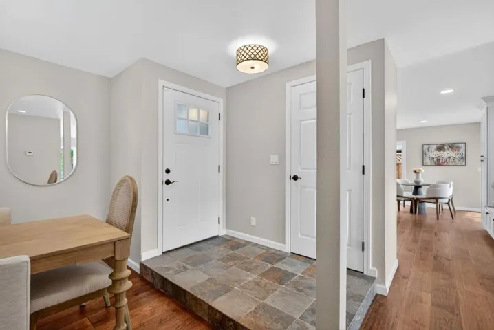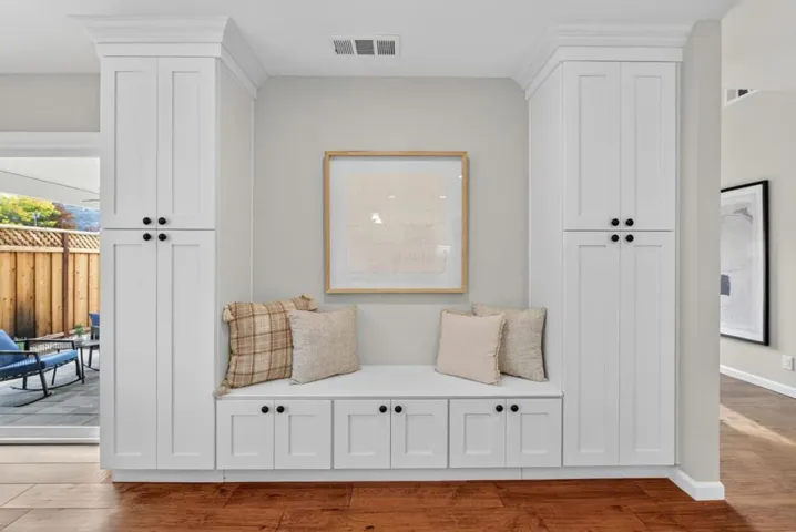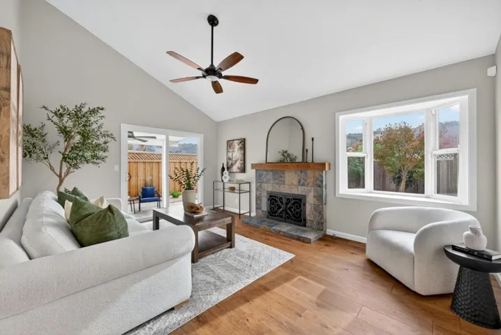 Welcome Home! This beautifully updated Blossom Valley home features 3 beds, 2 baths, 1,369 sqft of living space on a 6,060 sq ft lot w/ unobstructed views of the scenic Santa Teresa Foothills. Great curb appeal w/ beautiful pavers spanning the driveway, walkway, and patio. Enter into a welcoming dining area highlighted by a built-in dry bar w/ a quartz countertop, & glass-front cabinets. Adjacent is the spacious living room with a vaulted ceiling, beautiful tiled fireplace w/ a wood mantle & a bay window. Off the entryway, you’ll find the open-concept kitchen/family room combo, complete w/ quartz countertops & island, expansive custom storage, including a built-in bench with additional drawers & lateral cabinetry. The kitchen is equipped w/ SS Whirlpool appliances. Wide-plank engineered wood floors flow seamlessly through the kitchen, living room, dining room, and hallway. Primary & hall bathrooms are tastefully updated. Step outside to a well-maintained backyard w/ a newly built gazebo, perfect for outdoor dining, relaxation, and shade. Additional features include AC, recessed lighting, plantation shutters, ceiling fans, and so much more. Located within walking distance to highly rated Sakamoto Elementary School, this home offers comfort, convenience, and serene views.
