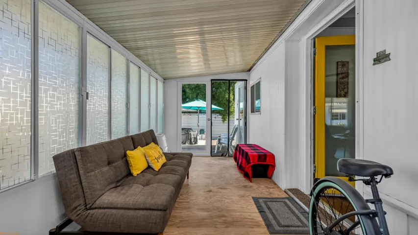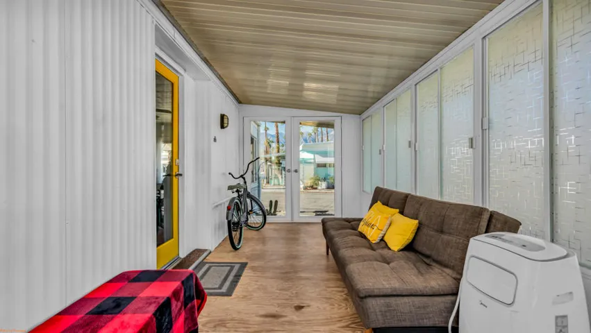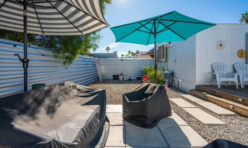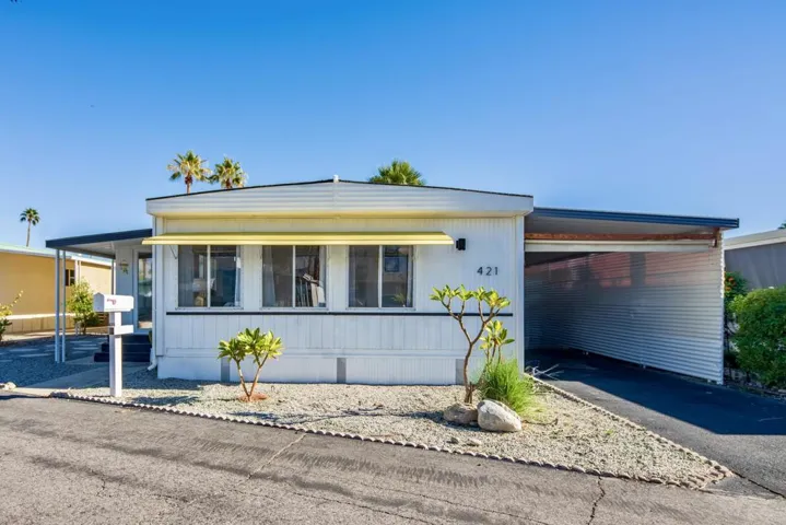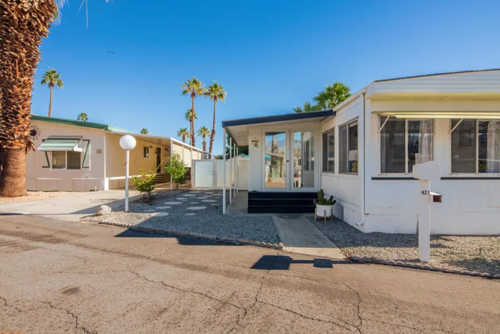 BEAUTIFUL 2BD/1BA manufactured home showcasing PRIDE OF OWNERSHIP with fresh, inviting aesthetic–inside and out in the desirable Royal Palms community–offering MODERN DESERT COMFORT with a CHARMING MID-CENTURY touch. Perfectly located in Cathedral City minutes from Palm Springs and Rancho Mirage with quick access to Hwy 111, this home provides convenience, style, and INCREDIBLE VIEWS.Step inside to a BRIGHT, ENCLOSED SUNROOM that FILLS the HOME WITH NATURAL LIGHT and opens into a SPACIOUS LIVING ROOM framed by STUNNING VIEWS of the SAN JACINTO MOUNTAINS. The dining area features a built-in buffet and pendant lighting, creating a warm and inviting space to entertain.The KITCHEN has been THOUGHTFULLY UPGRADED with BUTCHER BLOCK COUNTERTOPS, subway tile backsplash, gas cooktop, and newer refrigerator. A separate laundry area sits just off the kitchen for added convenience.The BATHROOM showcases a TASTEFUL REMODEL with UPDATED SINK AND COUNTERTOPS, a MARBLE-TILED SHOWER, and a bamboo feature wall for added texture and warmth. The primary bedroom offers generous space and a walk-in closet, while the guest room is perfect for visitors or a home office.Outside, the BACKYARD has been REFRESHED WITH GRAVEL, STONE PAVERS, FENCING and a charming gazebo–ideal for morning coffee, outdoor dining, or simply soaking in the breathtaking mountain views. The home is PARTIALLY FURNISHED and ready to add your personal finishesRoyal Palms offers resort-style amenities including a newly renovated fitness center, pool and spa, pickleball courts, BBQ area, RV storage, 3 parks for your furry friends,and more.