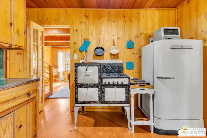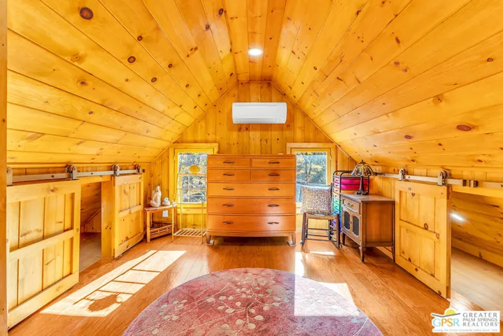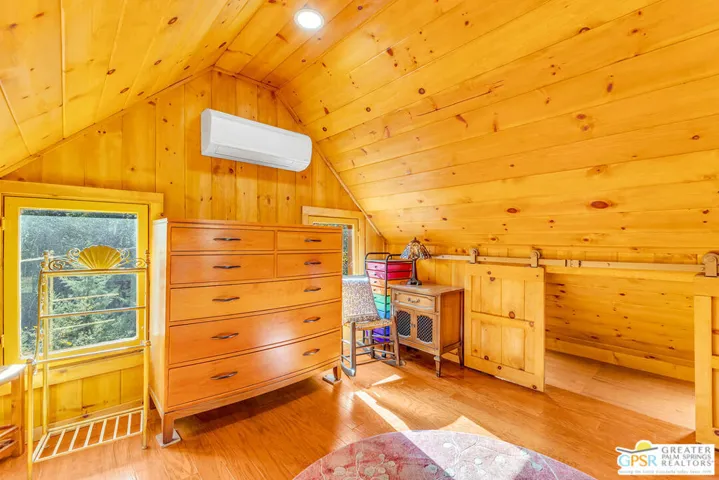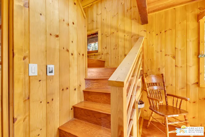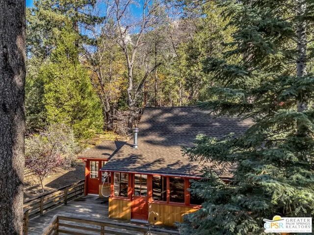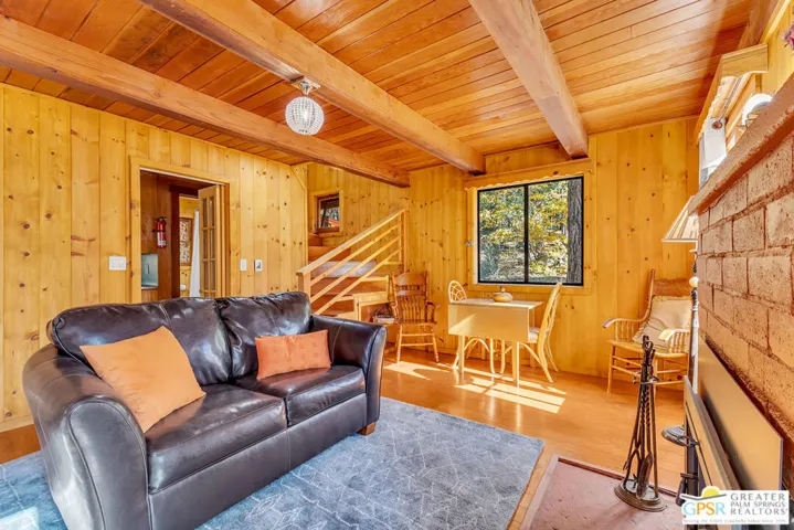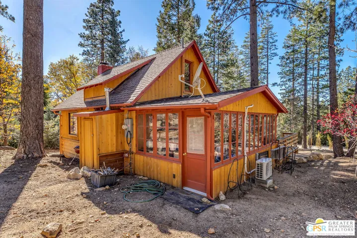 Unique opportunity to purchase a 1949 cabin with a terrific view of Tahquitz Rock in peaceful Fern Valley!. Recently renovated with new siding, new bathroom and new separate 2 car heated garage with finished storage loft. Natural light which floods two large sunrooms. There is a cozy wood burning vintage fireplace in the living room, a wood stove in one of the sunrooms, a mini-split in the other. The upstairs 2 room suite has a mini-split as well along with lots of storage. Spacious front deck completes this quaint getaway.