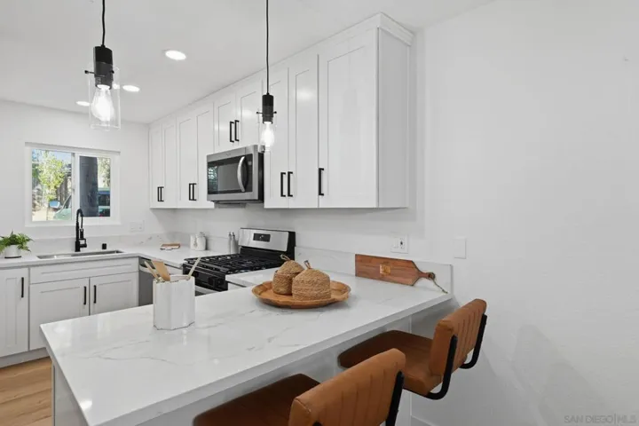 Beautifully renovated corner-unit townhome featuring modern upgrades and an exceptional indoor/outdoor living experience. This move-in–ready home offers an open and bright floor plan with updated flooring, fresh paint, and recessed lighting throughout. The remodeled kitchen showcases sleek cabinetry, quartz countertops, stainless steel appliances, and ample storage. Upstairs, you’ll find spacious bedrooms with upgraded fixtures and refreshed bathrooms with contemporary finishes. The primary bedroom provides generous closet space and great natural light. Enjoy one of the largest patios in the community; perfect for entertaining, relaxing, or creating your own outdoor oasis. Additional highlights include in-unit laundry, dual-pane windows, and an assigned parking space. Located in a well-maintained community close to shopping, dining, parks, schools, and convenient freeway access. This turnkey townhome offers comfort, style, and convenience in the heart of National City.