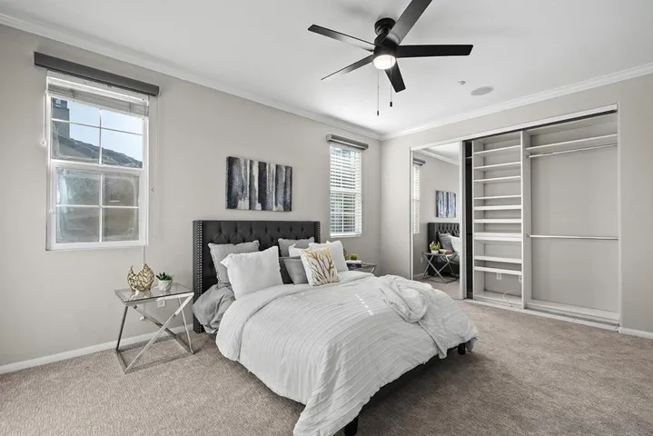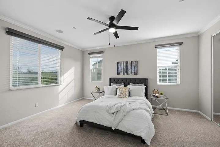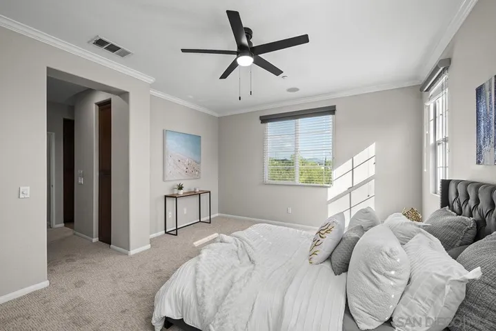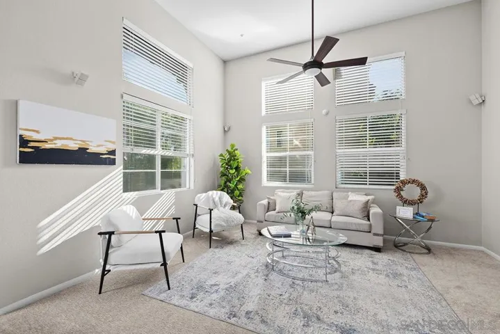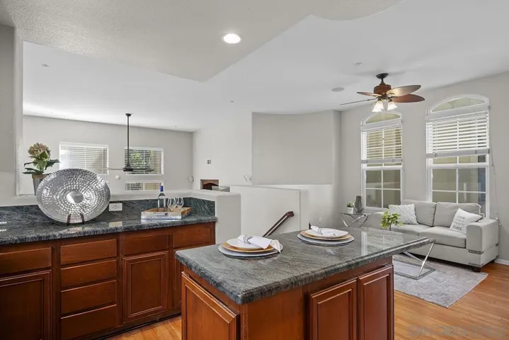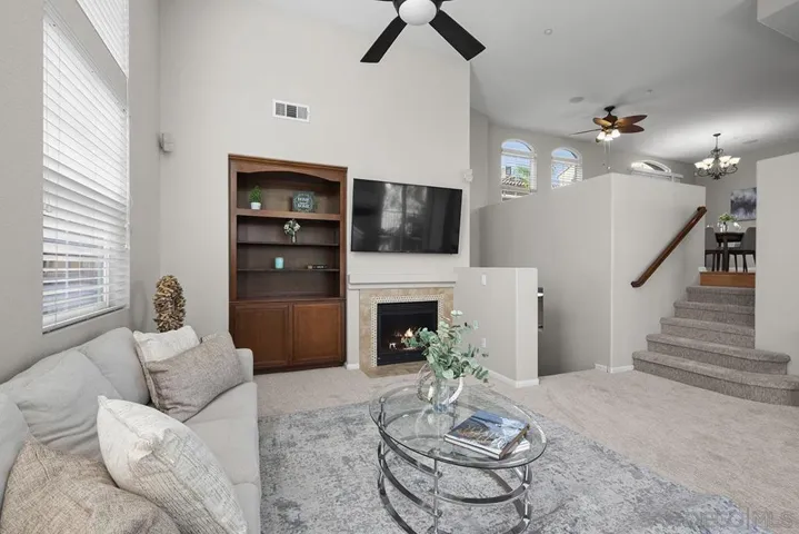 Don’t miss this rare, DETACHED 3-bedroom, 2.5-bath, 1,762 sq ft townhome with ZERO common walls in the coveted Villas at Escala gated community, PLUS OWNED SOLAR and Tesla Powerwall backup battery! Immaculately presented with upgraded cabinetry featuring glass inserts, a granite and stainless kitchen with center island, contemporary paint, and abundant natural light throughout. Open living area with high ceilings and multiple ceiling fans—perfect for entertaining. Step outside to one of the largest patio/yards in the community, tiled with a built-in firepit, plus a separate gated dog run with artificial turf, keeping water bills low. The 2-car garage includes built-in cabinetry and ample storage. Enjoy all the revered Escala Club amenities: two pools, spa, tennis, pickleball, basketball, fully-equipped fitness center, party room with full kitchen, media room, dog park, playground, barbecue/picnic areas, and walking trails—all with some of the lowest HOA dues in town! Located at the end of a cul-de-sac, this Villas Plan 3 home offers privacy from the landscaped hillside and tree-lined street below, with distant mountain views from upstairs. Abundant natural light and featuring high ceilings, fireplace in the large living area which is also wired for surround sound, multiple ceiling fans, and mirrored closet doors throughout. Recent updates include brand-new carpet, contemporary paint, and recently replaced water heater and HVAC system for worry-free ownership. The open kitchen is perfect for gatherings, with high-end cabinetry with glass door inserts, granite and stainless finishes, center island, and recessed lighting. The primary suite offers a walk-in closet plus an additional floor-to-ceiling mirrored wall closet and a luxurious ensuite with dual vanity and jetted tub. Prime Mission Valley location with easy access to Friars Road, the Fenton Parkway trolley stop, shopping, City library, and the I-15, I-8, I-805, and 163 freeways. Incredibly convenient retail across the street from the community from Costco, Ikea, Lowes, and numerous restaurants. Escala remains the most sought-after gated community in the area, combining lifestyle, privacy, and some of the lowest HOA dues in Mission Valley.