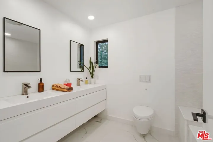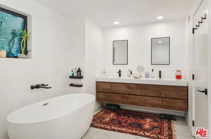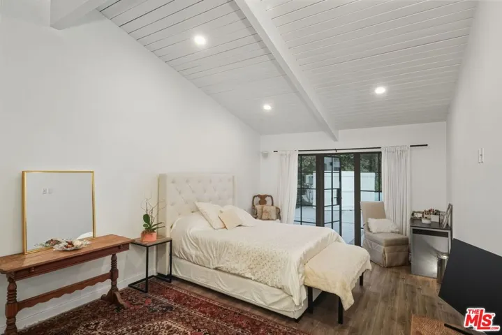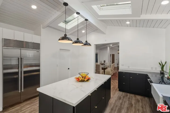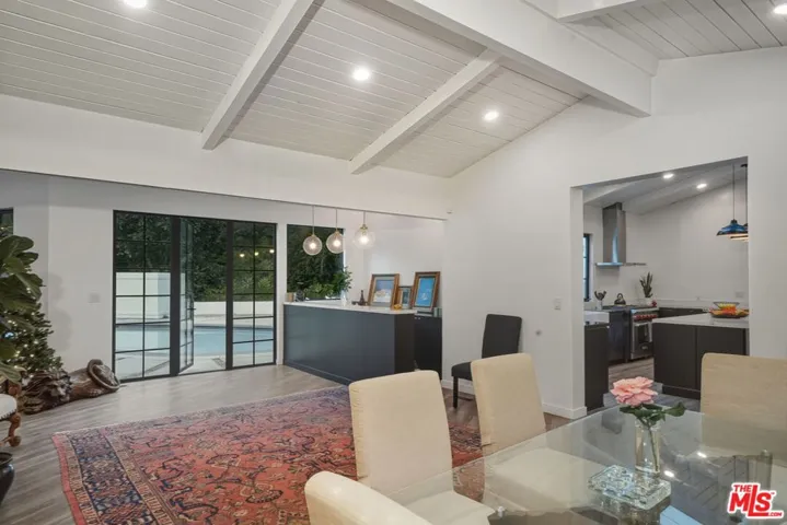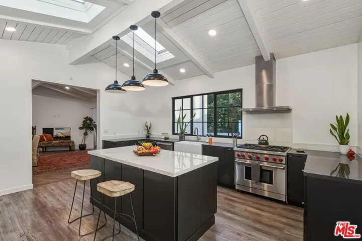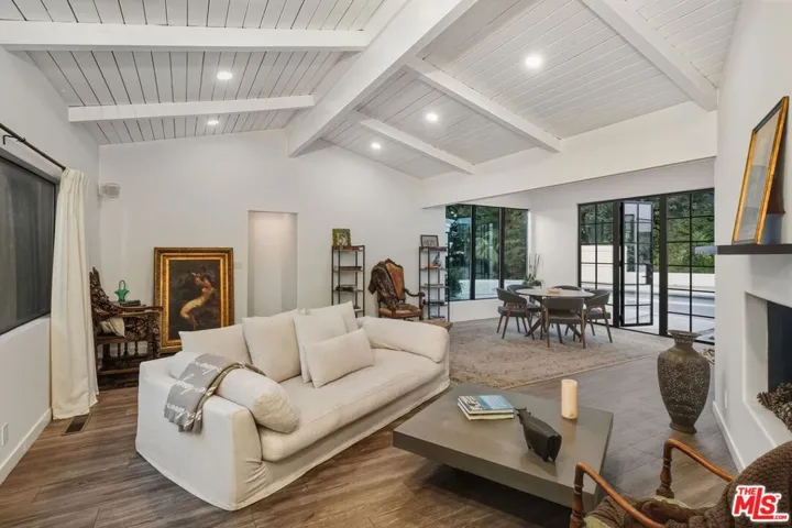 Striking Mid-Century Haven with Expansive Pool, Privacy & Canyon Views. Tucked behind a gated entrance off Upper Mandeville Canyon Road, this striking mid-century residence sits on a lush 12,455-square-foot lot dotted with mature myrtle and pepper trees. Thoughtfully expanded and remodeled, the 2,888 sqft architectural home blends timeless design with dramatic natural surroundings. Inside, ash veneer floors, pitched beam ceilings, skylights, and custom steel-framed windows and doors create a seamless indoor-outdoor experience, reflecting the expansive pool, patios, and serene canyon vistas beyond. The open living, dining, and family spaces offer warmth, flow, and abundant natural light, anchored by a luminous formal entry and double-sided fireplace. The chef’s kitchen is a showstopper, wrapped in wide picture windows framing verdant nature and outfitted with stainless steel appliances, a center island, quartz countertops, and generous pantry storage. Ideal for entertaining, the layout connects effortlessly to both interior gathering areas and the outdoor oasis. A private bedroom wing features two guest bedrooms and a beautifully appointed shared bath with double vanity and custom tilework. The luxurious primary suite is a tranquil retreat, boasting clerestory windows, a spa-inspired bath with a freestanding tub and open shower, an oversized walk-in closet, and French steel doors that open directly to the pool. Additional highlights include an oversized two-car garage with 420 sqft of flexible utility space or studio potential, serpentine pavers surrounding the home, and a rare sense of serenity just moments from Brentwood’s coveted dining/shopping scene.