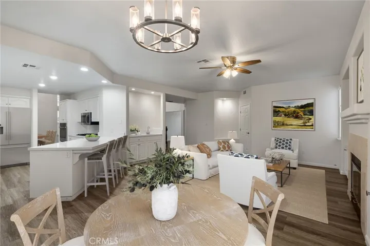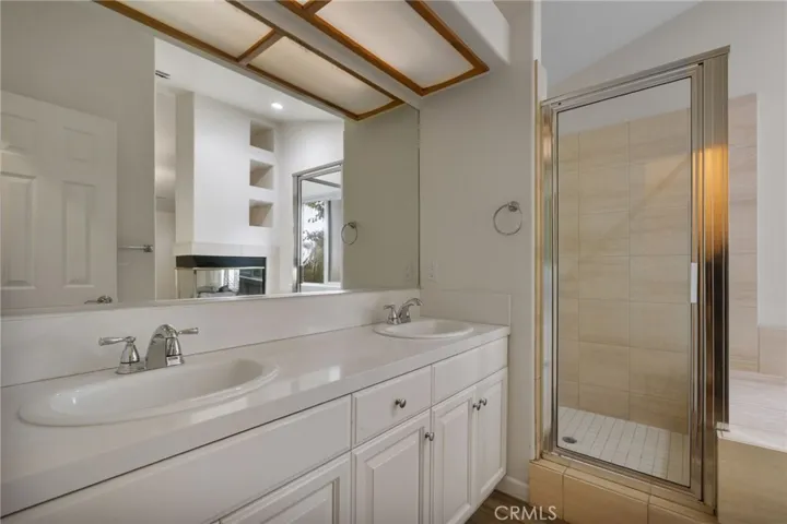 Beautifully updated 4-bedroom, 3-bath home with soaring ceilings, wood-look flooring, and an easy-flow layout. The formal living room features a cozy fireplace, while the open family room offers a second fireplace and a fun wet bar perfectly positioned to serve snacks, sips, and smooth access to the kitchen. The bright kitchen includes white cabinetry, quartz counters, and a large breakfast bar. A convenient downstairs bedroom sits next to a bath, ideal for guests or multigenerational living. Upstairs, the spacious primary suite boasts a dual-sided fireplace shared with the spa-like bath, complete with soaking tub, separate shower, and dual sinks. The backyard features an outdoor built-in grill, plus a pergola-style patio equipped with a ceiling fan—perfect for shaded lounging or outdoor dining and mature trees add privacy. A 3-car garage completes this move-in-ready home located in the desirable Stockdale High School district and close to popular restaurants and conveniences.