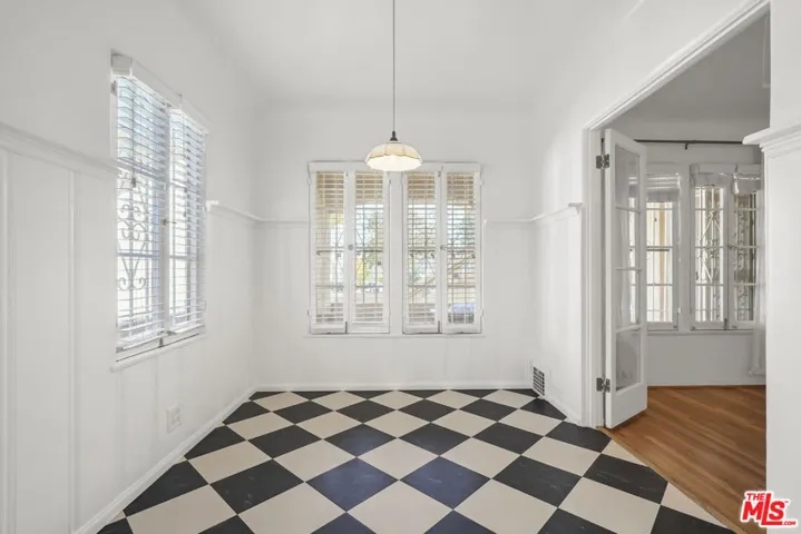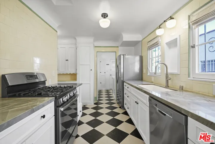 An exceptional Spanish masterpiece, this exquisitely updated duplex offers a rare opportunity to experience the elegance where timeless architectural character meets elevated modern living. Every detail has been thoughtfully curated to honor the home’s original charm from the breathtaking moldings to the impeccably crafted built-ins. This expansive first-floor residence features 3 bedrooms and 2 baths across 2,034 sq. ft., showcasing refinished hardwood floors, abundant natural light through a stunning front window, and a sophisticated decorative fireplace that anchors the spacious step-down living room. The gourmet kitchen is equipped with stainless steel appliances and is complemented by a gorgeous breakfast room adorned with original cabinetry and a striking checkerboard floor that continues throughout the kitchen area. Bathed in natural light, the breakfast room beautifully highlights the home’s vintage craftsmanship. Just off the kitchen, a dedicated serving area with original cabinets adds both charm and convenience, while a full-size washer and dryer are thoughtfully placed in a separate laundry room. Step outside to the private patio an entertainer’s haven perfect for al fresco dining and grilling. Additional premium features include a private garage with two-car parking and an enviable location moment from Hancock Park and within easy reach of Downtown LA and the Westside. A home of this caliber is truly a rare find an impeccable blend of historic beauty and contemporary luxury.