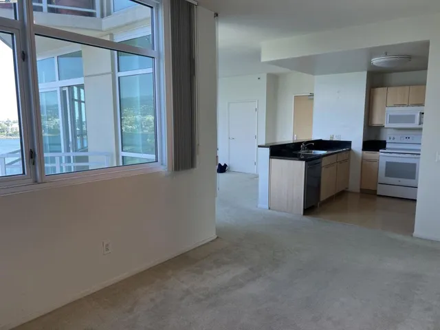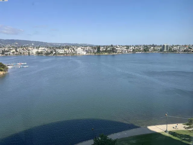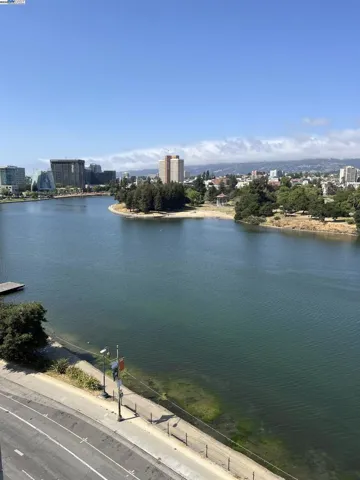 Spacious corner unit with 270° lake and city views! This rare 2-bedroom, 2-bath condo at The Essex offers 1,349 sq ft of elevated living with breathtaking views of Lake Merritt, the Oakland skyline, and hills from every room—including a large bonus area ideal for dining, a home office, or reading nook. This light-filled home features plush carpet flooring, 9-foot ceilings, expansive windows, and an open-concept great room and kitchen. The kitchen is equipped with newer appliances, including a stove, dishwasher, refrigerator, microwave oven, and heaters for year-round comfort. The spacious primary suite includes a walk-in closet and a luxurious bathroom with a view. Enjoy 2 indoor parking spaces and access to resort-style amenities: lap pool, spa, fitness center, business center, clubhouse, and 24-hour concierge/security. Just steps from Lake Merritt and close to BART, Grand Lake, Uptown, and Downtown dining and shopping.