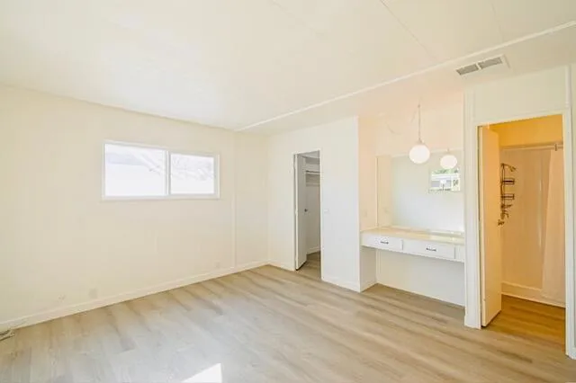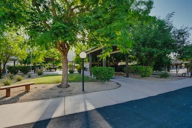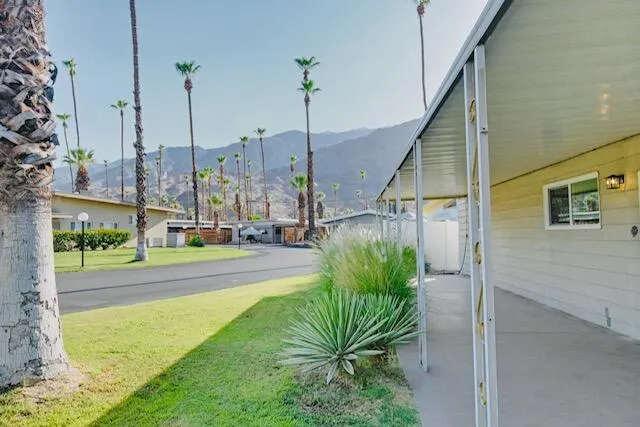 This refreshed 2-bedroom, 2-bath home offers an open floor plan, abundant natural light, and a serene atmosphere throughout. Situated on a spacious corner lot in the 55+ Sahara Park community, the property captures impressive views of the San Jacinto Mountains. Recent upgrades include fresh interior paint, brand-new luxury vinyl plank flooring, new plumbing, and fully cleared electrical and HVAC inspections. The home features central air, including an American Standard A/C unit. Newly installed double-pane windows and sliding doors enhance energy efficiency and comfort. The bright living and dining areas flow into an updated kitchen appointed with quartz countertops, a quartz composite sink, Delta faucet, new 5-burner cooktop and hood, new oven, and a new Frigidaire refrigerator. Washer/dryer hookups are located just off the kitchen for convenience.Outdoor highlights include an oversized front porch with original scrollwork, a private carport accommodating up to three vehicles, and multiple storage options including a shed. The primary suite offers a walk-in closet, vanity, and private bath; the secondary bedroom provides an extra-large closet and easy access to the second full bath. The community offers resort-style amenities including a pool, spa, gym, modern community kitchen, library, card room, media area, walking paths, shaded seating, and an active social calendar.Located minutes from downtown Palm Springs and the airport, with convenient access to Los Angeles, San Diego, and Big Bear–all approximately a two-hour drive–this move-in-ready home is an excellent opportunity.What the Owner Loves:A peaceful and private setting with sweeping mountain views, a prime lot with generous outdoor space, and a quiet, relaxing environment within the community.Buyer(s) to apply to park management for residency approval.