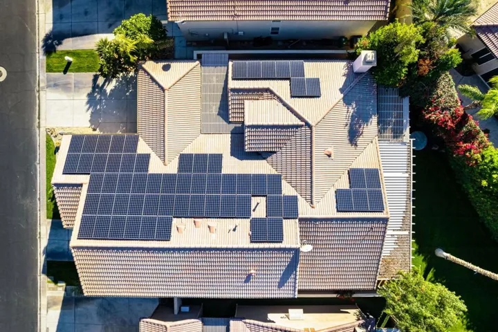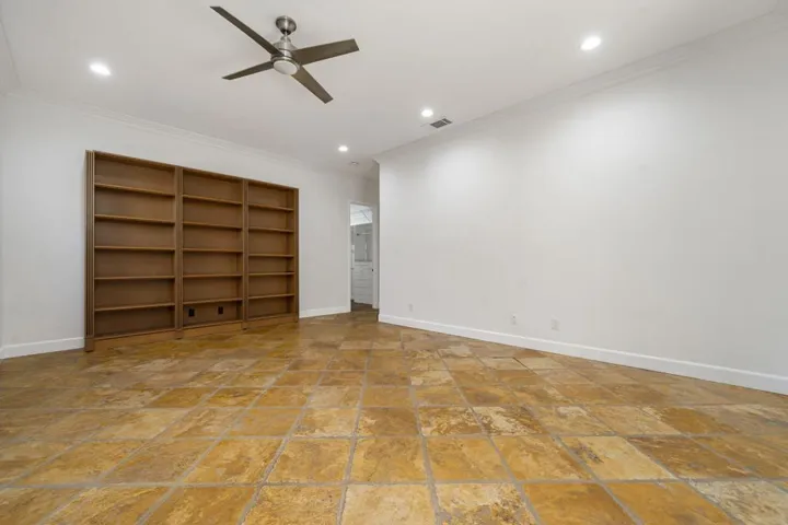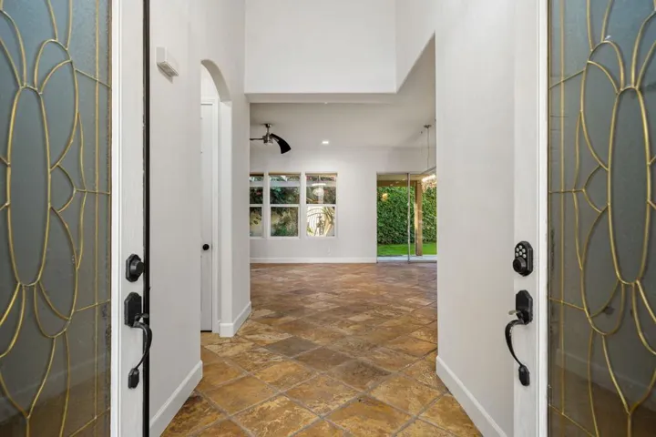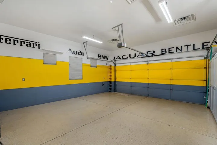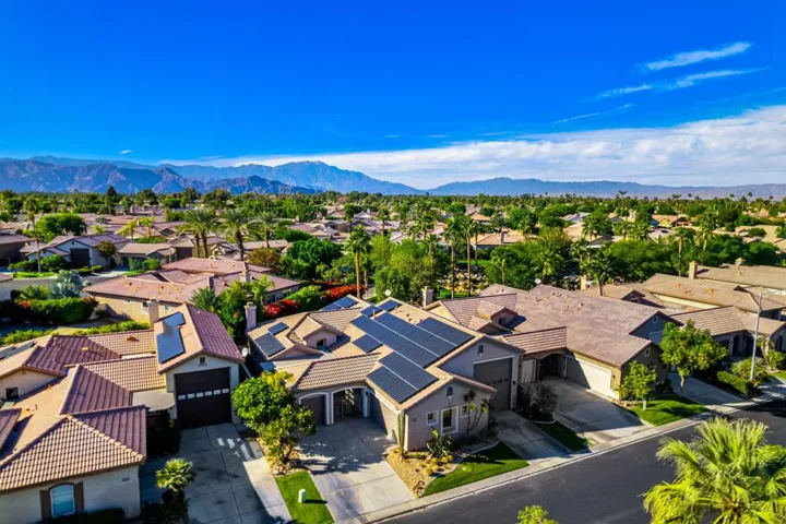 All the bells, all the whistles–absolutely no corners cut.This beautifully upgraded 3-bed, 3-bath home features owned solar, fresh interior paint, elegant travertine flooring throughout, and a freshly remodeled primary bathroom.Car lovers, hobbyists, and storage fanatics will drool over the spectacular 5-car garage, complete with custom paint, epoxy floors, built-in cabinets, and a 240V EV charger. The generously sized RV bay connects to the 2-car garage in an L-shape, while the golf-cart garage remains separate–parking perfection.A large driveway and gated courtyard create a welcoming entry. Inside, the spacious great-room layout includes built-in shelving and a cozy fireplace. Sliding doors off the dining area lead to an expansive covered patio with a second gas fireplace, open to a private lawn that extends to a serene common area with a pond, waterfall, and lush landscaping.The community allows short-term rentals and offers multiple pools, making it ideal as a full-time home, getaway, or investment. Note that some photos have been virtually staged with furniture.