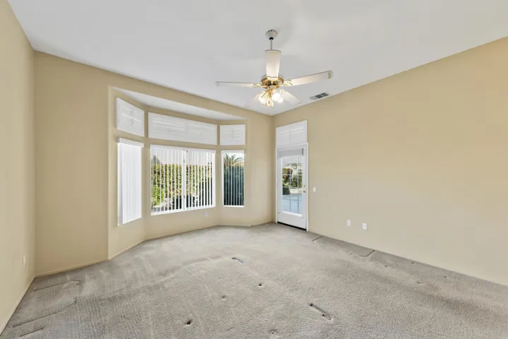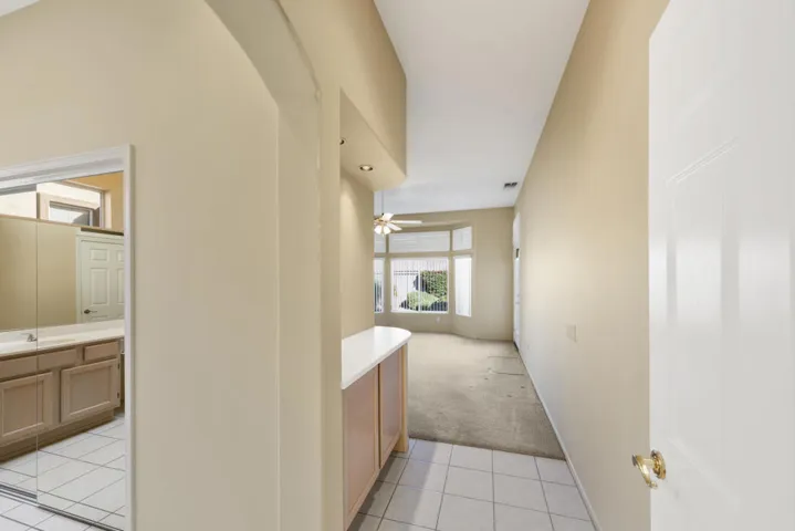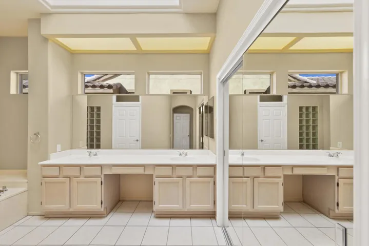 Sun City Palm Desert – Welcome to a desirable Baccarat model ( approx. 1836 square feet) that is located on a quiet culdesac within walking distance to our Mountain view Clubhouse. Excellent location with great curb appeal. Includes a gated front courtyard patio to enjoy colorful desert sunsets and a double door entry. Two bedrooms, two baths, plus den/office area. Enter the home into the living/dining area with views to the spacious and very private rear patio area. HVAC was replaced in 4/2021 and water heater replaced in 12/2020.The Kitchen is very striking with rich cocoa cabinetry and new quartz countertops. Stainless steel appliances were replaced a few years ago with new hardware at the kitchen sink. Also has additional storage with a pantry closet. Kitchen faces an open family room with tiled flooring and an inviting fireplace. It has a bay window overlooking the back patio.New verticals and shutters are on the windows since 2020. Both bathrooms have hadShower heads upgraded along with new faucets and new high sit toilets. The primary suite is very spacious with a bay window and the bathroom is outstanding with huge skylights for wonderful lighting! Dual vanities with a stall shower, oversized tub and a large walk in closet. The secondary bedroom has a bath with a tub/shower combo . The den/office area is tiled and has a separate closet for storage. This home has been meticulously maintained and is virtually ”staged” for your convenience to mentally place your own furniture. Make this pristine home your own within one of the top retirement communities in the USA according to Money Magazine! You will have a safe, securely gated community with 2 golf courses, pro shops, driving range, pitching and chipping practice areas and an 18 hole putting course.