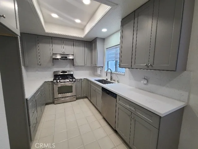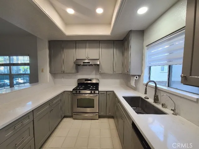 Located in the gated La Mirada Town Center Townhomes, this pristine end-unit offers comfort, privacy, and style—no one above or below and only one shared wall. NEW PAINTING AND NEW FLOORING(2nd floor). This exceptional tri-level home features 3 spacious bedrooms and 2.5 bathrooms, filled with natural light from numerous dual-pane windows. The inviting front porch welcomes you into an open and airy floor plan highlighted by a cozy tile fireplace, recessed lighting, and newer waterproof laminate flooring on the main level with tile at the entry and carpet upstairs. The remodeled kitchen showcases Quartz countertops and backsplash, upgraded gray cabinetry, stainless/black appliances, tray ceilings, and a bright breakfast nook. A convenient half bath and indoor laundry area are also located downstairs. Upstairs, the elegant primary suite offers dual sinks, a large walk-in closet, and French doors leading to a private balcony with peaceful, tree-lined views—perfect for morning coffee or evening relaxation. Additional upgrades include newer HVAC, water heater, light fixtures, toilets, and mirrored closet doors. Direct access to a two-car garage(OVER SIZED), along with guest parking and nearby street parking, add everyday convenience.