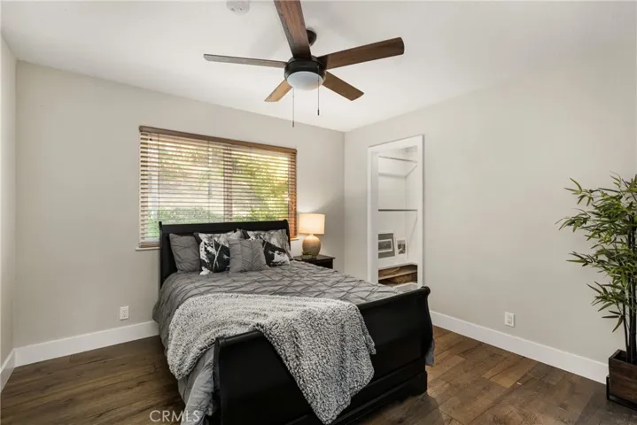 bedroom/office with modified closet and a bathroom with walk-in shower. The