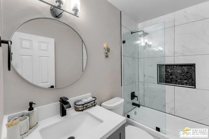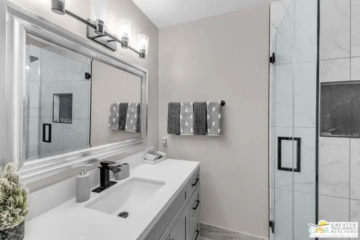 Step into modern desert living in this beautifully remodeled end-unit condo in Villas De Las Flores, situated on land you own. This light and airy 2-bedroom, 2-bath residence has been thoughtfully renovated from top to bottom, offering both style and peace of mind. Inside, the home features new cabinetry, quartz countertops, stainless steel appliances, and a clean, contemporary design that feels fresh and inviting. Beyond the cosmetic updates, the property truly stands out for its major system improvements, including new plumbing, a newer HVAC system, and a new water heater, significant upgrades that add long-term value. As an end unit, the condo enjoys abundant natural light and the oversized private patio, with mountain view, extends the living space outdoors. Located near the clubhouse, the home offers convenient access to community amenities. Villas De Las Flores is known for its resort-style lifestyle, featuring multiple pools and spas, tennis and pickleball courts, a fitness room, and a community library. Monthly HOA dues include water, trash, and earthquake insurance, providing excellent overall value. Ideally located in desirable South Palm Springs, you are just minutes from dining, shopping, golf, hiking trails, and the vibrant downtown scene. Experience this exceptional home in person-schedule your showing today.
