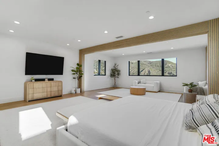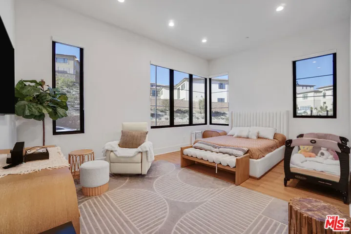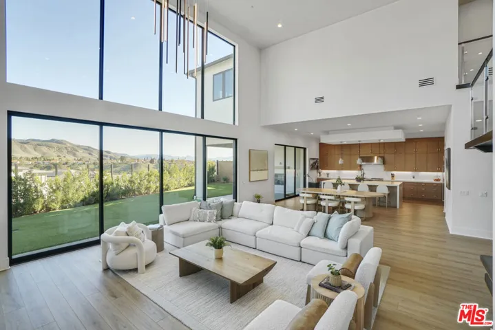 Discover architectural excellence in this highly coveted Toll Brothers Asti floor plan, ideally positioned on a coveted corner lot in Westcliffe. Tinted front windows and garage door bring a sophisticated, modern touch to the exterior while enhancing privacy and curb appeal. With 5 bedrooms, 5.5 bathrooms, and an expansive open-concept layout, this residence exemplifies sophisticated design and effortless indoor outdoor living. Upon entering through the grand solid wood and glass door, you are greeted by soaring 24-foot ceilings, walls feature a cloudy, mottled texture created with lime wash paint and a bright, airy floor plan that immediately feels like a private sanctuary. Floating stairs make a dramatic architectural statement, while expansive windows and oversized stackable doors flood the Great Room and chef’s kitchen with natural light. The gourmet kitchen is a true showpiece featuring floor-to-ceiling custom cabinetry, upgraded backsplash and countertops, and a stunning Montreal Quartz waterfall-edge island as the centerpiece. Premium Wolf appliances, a Sub-Zero refrigerator and Restoration Hardware hardware create an entertainer’s dream setup. A spacious walk-in pantry offers abundant shelving and storage for all your culinary essentials. The first level also includes a versatile office/media room, a flex space ideal for a gym, and a private guest bedroom with a full bath.Upstairs, the luxurious Primary Suite serves as a private retreat, complete with its own lounge area, warm wood panel accenting, and panoramic city and mountain views. The spa-inspired bathroom features dual vanities, a rain shower head, a Calacatta Umber marble shower, and a freestanding soaking tub. Each additional bedroom includes its own en-suite bathroom with upgraded tile, mirrors, and countertops, ensuring comfort and privacy for family and guests. A spacious loft on this level captures dramatic views through towering windows. Outdoor living is elevated with smart-home enhancements, outdoor fireplace and plenty of space for your own oasis. Other features: SOLAR PANELS are owned, home is pre-wired for in-wall speakers The expansive tandem 3-car garage provides ample space for vehicles and storage. Conveniently located near The Vineyards shopping center, Whole Foods, AMC, award-winning schools, and easy access to the 118 freeway, this is a rare opportunity to own one of Porter Ranch’s most prestigious and breathtaking estates. Conveniently located near The Vineyards shopping center, Whole Foods, AMC, award-winning schools, and the 118 freeway, this is a rare opportunity to own one of Porter Ranch’s most prestigious and breathtaking estates. Make sure to View the Virtual Tour of this stunning home!!