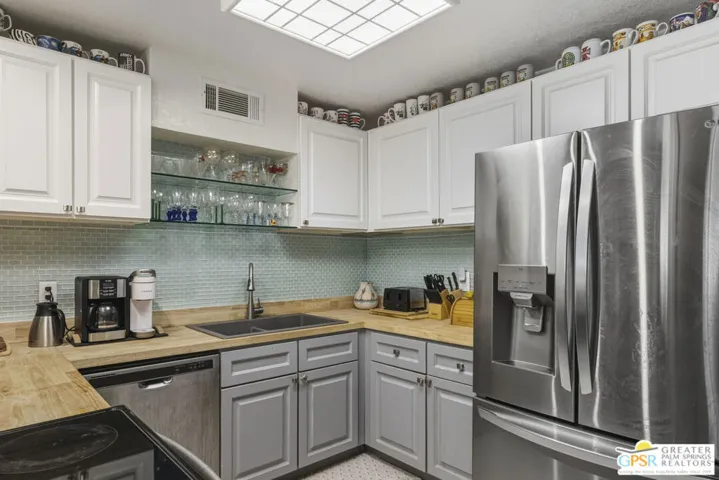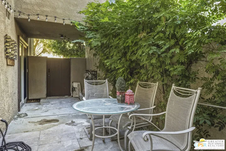 Fee Simple, prime, ground floor unit in Pueblo Sands with mountain view and laundry. This unit has many upgrades and features that make it unique. Double pane windows and sliding glass doors! A retractable sun shade in the front patio! This unit has a rare gate on the back patio for easy access. Part of the patio was enclosed to create a dining room with french doors. The owner installed a gorgeous buffet with cabinets (butler’s pantry) in the former dining room. The large kitchen and butler’s pantry area have butchers block countertops. There are recessed lights in the kitchen and bathrooms. There is a wall cut out creating an open kitchen and living room concept. There are some smooth ceilings, and a walk in closet. Enjoy the lovely mountain and courtyard views out every window. Pueblo Sands is a gated community with 2 pools, 2 spas, dog park, and clubhouse. It is close to beautiful El Cielo Rd and Tahquitz Canyon Way and the Palm Springs International Airport. Enjoy dining by the airport or head 2 miles west to Downtown Palm Springs. Easy access to the Smoketree Shopping area and the Gene Autry shopping area. The owner is looking do a seller lease back as a long term tenant. Great opportunity for someone wanting to purchase an income property or 1031 exchange! Buyer to verify all details