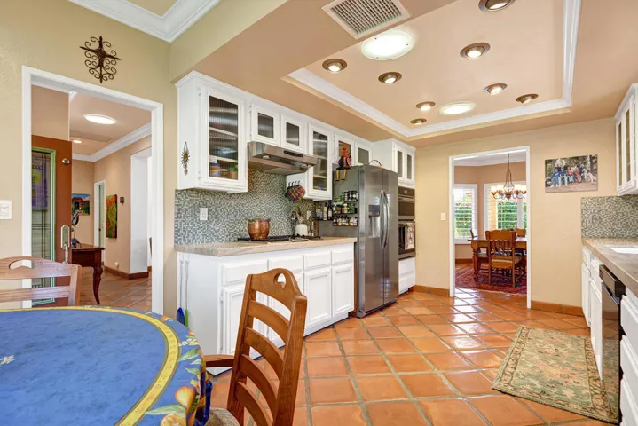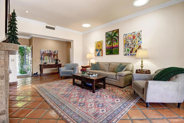 This beautifully private residence offers classic Spanish Colonial charm and effortless indoor-outdoor living, highlighted by a sun-filled, south-facing backyard with a fully covered, oversized patio and breathtaking mountain views abound. Backing directly to a lush greenbelt, the home enjoys rare privacy and tranquil desert surroundings, while one of the community’s sparkling pools sits just steps away. Inside, warm, inviting tones are accented by authentic Saltillo tile flooring found both indoors and throughout the outdoor living spaces. High ceilings are enhanced with elegant crown molding, while multiple solar tubes create an airy, light-filled atmosphere. Plantation shutters add timeless style throughout, while thoughtfully updated kitchen and bathrooms blend classic charm with modern convenience. The garage features clean, upgraded epoxy flooring, adding both function and a polished finish. Located within the sought-after Laguna De La Paz lake community, residents enjoy access to 15 pools, 16 spas, 5 tennis courts, 2 pickleball courts, a well-equipped fitness center, and an active clubhouse. A favorite centerpiece of the community is the stunning 4+ acre lake, complete with a scenic walking path, lakeside gazebos, and resident-only pontoon and pedal boats–perfect for sunrise strolls, relaxing afternoons, and peaceful boat rides. Experience resort-style living, natural beauty, and a true sense of community–all in one exceptional home.
