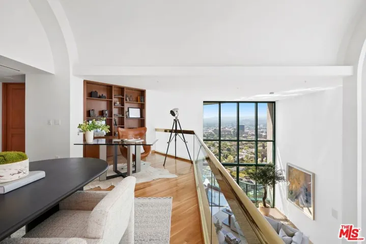 **Rare Penthouse at The Blair House -The Pinnacle of Wilshire Corridor Living** Perched atop the iconic Blair House, one of the most prestigious full-service addresses on the Wilshire Corridor, this rare penthouse offering blends dramatic design, contemporary elegance, and sweeping panoramic views into a truly unforgettable residence. Step into the striking formal entry where a sculptural spiral staircase introduces you to soaring 25-foot ceilings and vast, floor-to-ceiling windows that flood the living space with natural light. From the Griffith Observatory to The Getty and beyond, nearly every room offers unobstructed, picture-perfect views. The expansive living room seamlessly extends to a private balcony an ideal backdrop for indoor-outdoor entertaining. A formal dining room comfortably seats 12+ with inspiring vistas toward the Hollywood Hills and Downtown Los Angeles. A stylish den with built-in wet bar creates an inviting space for intimate evenings or movie nights. The newly renovated chef’s kitchen boasts premium appliances, sleek cabinetry, and an adjacent breakfast area offering tranquil morning views. A private en-suite guest room sits quietly on the main floor, providing comfort and separation. Upstairs, access the second level via your own in-unit elevator to discover three spacious bedroom suites and an airy loft lounge or home office, all oriented to capture dramatic skyline scenes. The primary suite is a luxurious retreat with a private sitting area, balcony, and an indulgent, spa-inspired bath. Dual bathrooms offer a sauna, soaking tub, oversized shower, vanity area, and separate walk-in closets. An attached gym or office completes the suite, surrounded by floor-to-ceiling views. Additional highlights include:- Smart home integration with new AV system, high-speed Wi-Fi, security upgrades – Modern designer lighting throughout – Ample in-unit storage and closet space Residents of The Blair House enjoy five-star amenities: a resort-style pool and spa, rare tennis court, cutting-edge fitness center, meeting suite, 24-hour valet and concierge, and round-the-clock security, an unmatched lifestyle in one of LA’s most desirable high-rise communities.