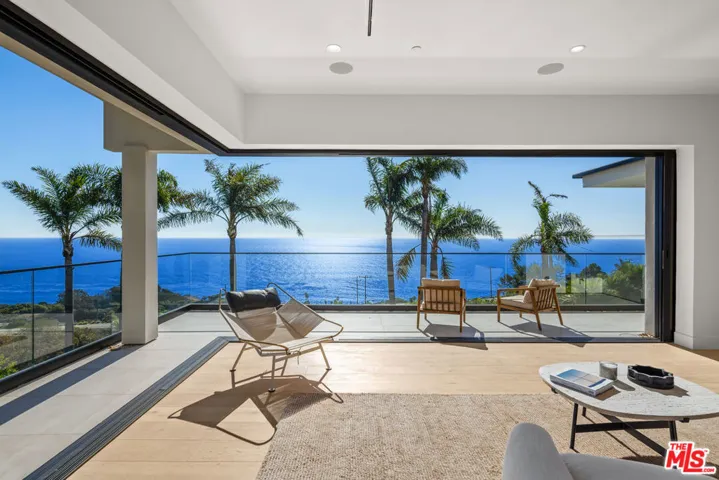 This newly built Malibu retreat offers resort style living with complete privacy and effortless indoor outdoor flow. A dramatic 24 foot glass gallery entry and open air atrium introduce the home’s modern coastal design. The main level features an open dining and kitchen pavilion with a sculptural marble island, custom rift oak cabinetry, panel ready Thermador appliances, and pocketing walls of glass framing peaceful treetop and hillside views. The great room and adjoining bar lounge open to the infinity edge pool, with wraparound sliders capturing unobstructed ocean vistas. Just behind the bar sits a spacious bonus room ideal for a theater, game room, or entertainment space. A sleek fitness studio with its own en suite bath is located off the kitchen, creating a second large bonus space. The home offers four en suite bedroom suites and five baths, thoughtfully designed for comfort and privacy. Upstairs, the primary suite showcases floor to ceiling glass, pocket doors, and panoramic coastline views, along with a boutique style walk in closet and a spa inspired bath with soaking tub and dual vanities. All four suites include walk-in closets, and three enjoy private ocean view balconies. The grounds are tailored for relaxation and entertaining, featuring multiple terraces, flat grassy areas, lush landscaping for total seclusion, natural pathways, and an infinity pool that blends seamlessly into the horizon. Additional features include a detached garage and an oversized gated driveway with abundant parking. A rare combination of privacy, architecture, and coastal living perched above one of Malibu’s most dramatic stretches of shoreline.