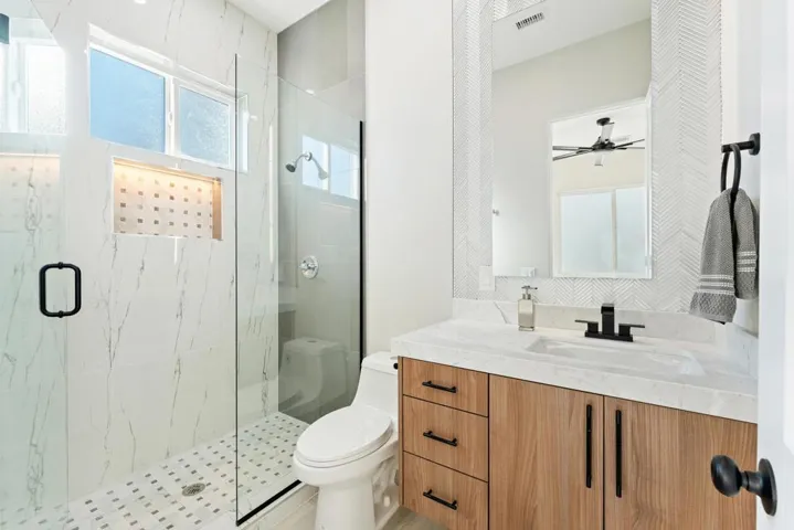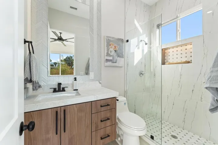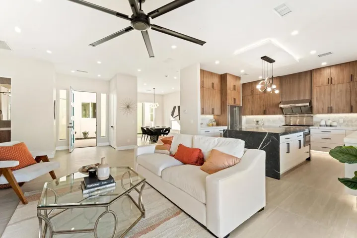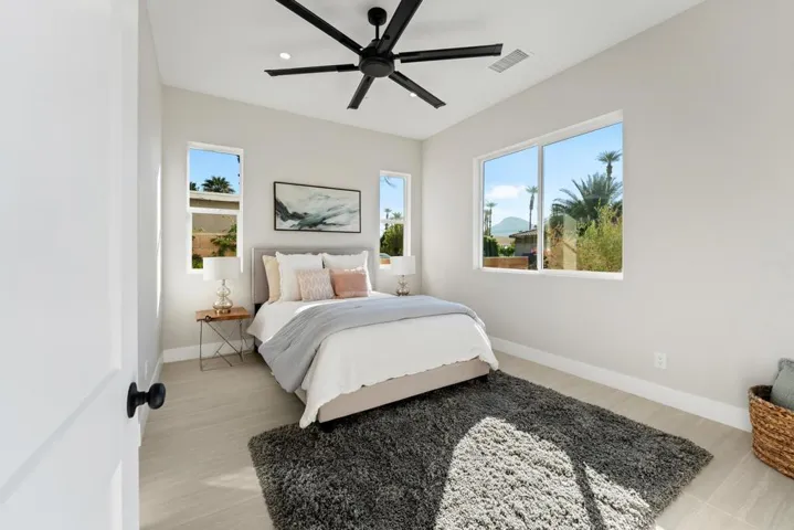Welcome to 74096 Goleta Ave, a newly built Modern Desert Compound offering the perfect blend of luxury living and investment potential. This property sits on one APN that includes two addresses (74096 & 74098), creating a true compound rather than a traditional duplex. The 2,101 sq ft main residence features high-end commercial-grade kitchen appliances, dual refrigerators, a stunning oversized center island with custom marble and a waterfall feature, 3 bedrooms, 2.5 baths, and a spacious open-concept design with modern architecture and premium finishes throughout. The fully detached 893 sq ft ADU includes 2 bedrooms with dual master suites, ideal for rental income, guests, or multigenerational living while maintaining complete privacy. The outdoor spaces offer a resort-style experience with a designer pool featuring stunning water features, a 12-person oversized jacuzzi, and breathtaking panoramic mountain views from the backyard. Additional highlights include a beautiful putting green to practice your short game and a large outdoor bar/versatile area equipped with a sink, mini fridge, and abundant storage. The 508 sq ft covered patio includes a professional ceiling-integrated misting system for year-round comfort. Two TVs (one inside and one outside) are included in the sale. The oversized 675 sq ft EV-ready garage provides exceptional parking, storage, or workspace flexibility. Fully paid solar adds meaningful long-term value and keeps operating costs low–appealing to both homeowners and investors. Located minutes from El Paseo, shopping, dining, and major Palm Desert amenities, this property delivers contemporary design, premium features, and outstanding versatility for personal use, short-term stays (if permitted), or long-term rental performance.