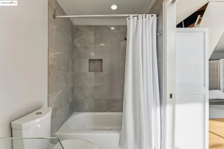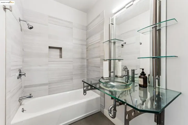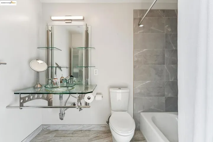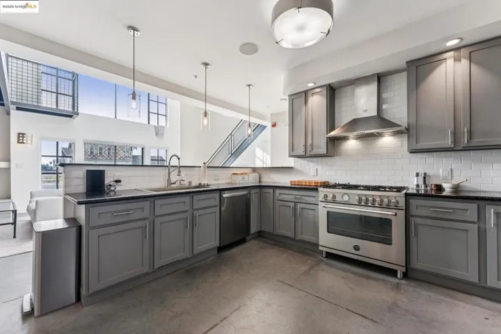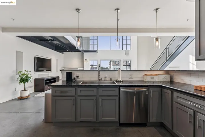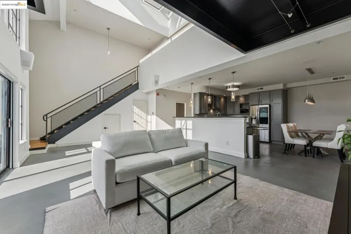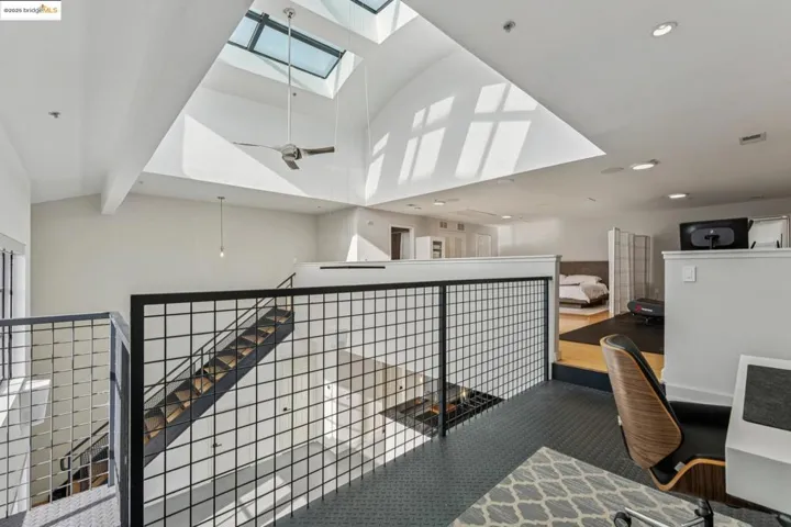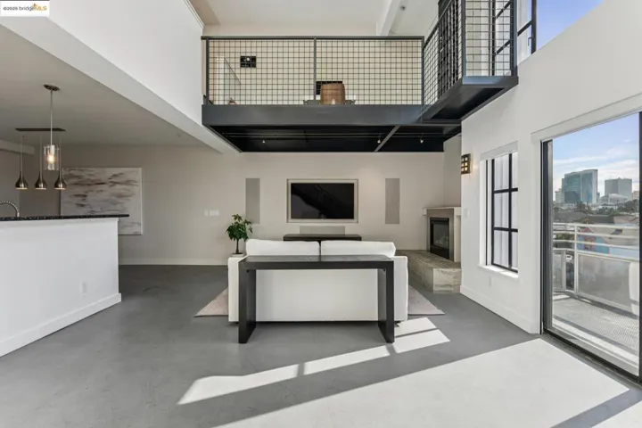 Chic and sophisticated top-floor, end-unit loft offering an open, light-filled living experience with multiple skylights and dramatic floor-to-ceiling windows capturing downtown Oakland views. With approximately 1,613 square feet, the expansive main level features concrete floors, a generous kitchen with breakfast bar, gas fireplace, contemporary lighting, and an open living and dining environment ideal for both everyday living and entertaining. The mezzanine level overlooks the living area and provides a large, flexible bedroom space with potential to be configured into two private rooms. A catwalk workspace offers an ideal office or creative area. Additional storage is plentiful, including a spacious, stand-up attic accessed by pull-down ladder. The primary closet has been enhanced with a custom organization system for optimal storage and function. The home is wired for integrated smart home functionality for lighting, climate, and audio/visual components. Secure garage parking with additional storage included. A rare blend of volume, light, storage, and flexible living space in a true urban loft setting.