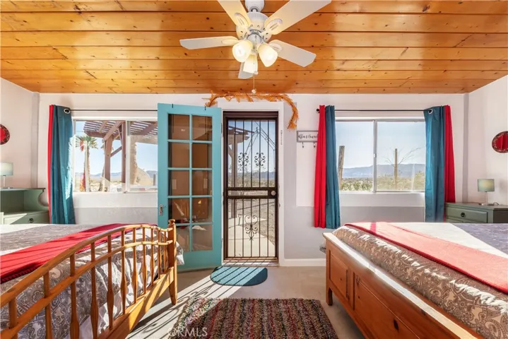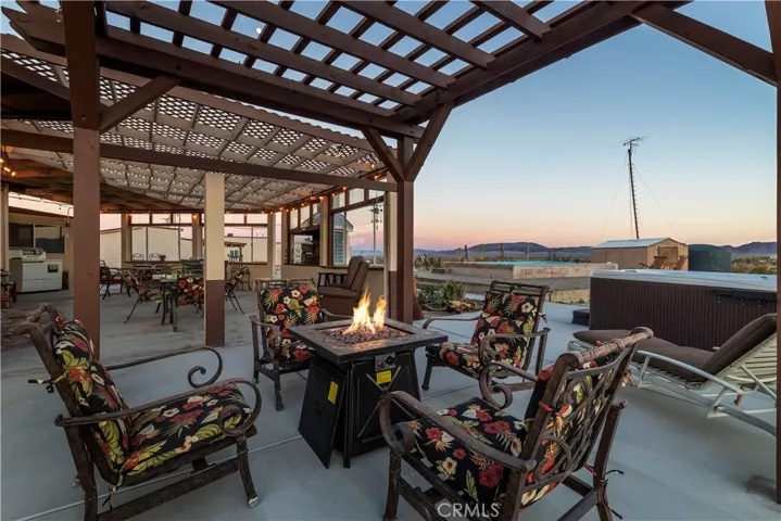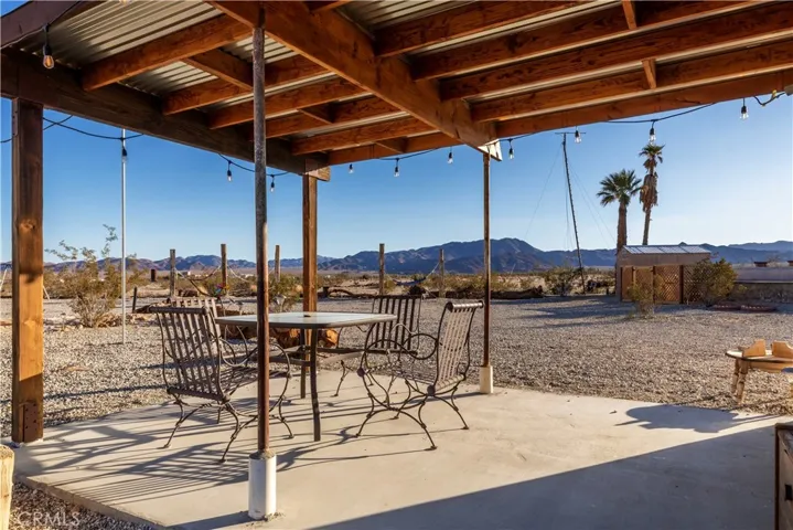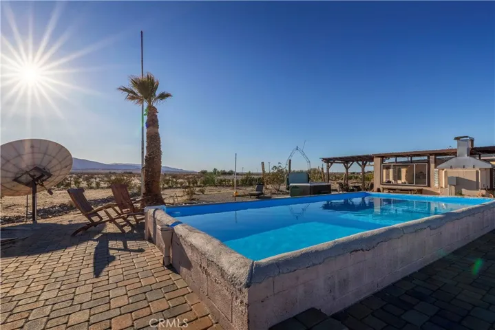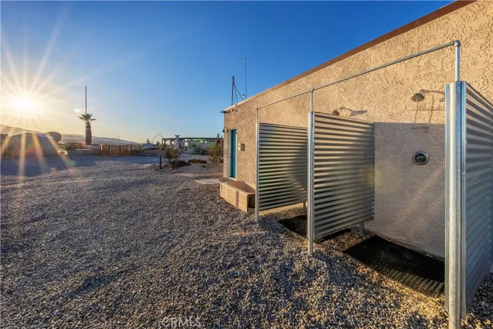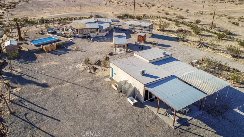 Escape to a secluded 20-acre corporate retreat compound designed for privacy and serenity. This exceptional property boasts three homes and 4 APNs, a tranquil yoga room, and two inviting pools, creating the perfect setting for both relaxation and recreation. The central building features a sunlit yoga studio with sliding glass doors that open to stunning views of the expansive desert landscape. A bright kitchen, complete with a dining table, lounge chairs, and sliding glass doors, offers an ideal space for meals or quiet moments with tea. The main house includes an open bedroom, two bathrooms with showers, a covered patio lounge, and two outdoor showers. Step outside to a shaded patio that leads to a pool and deck, where you can unwind while taking in the vast desert scenery. An exterior shaded area features a private outdoor bathroom equipped with a sink, shower, and toilet.