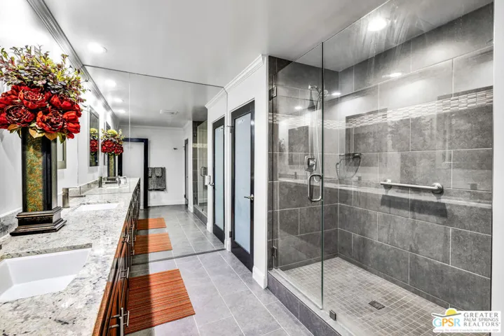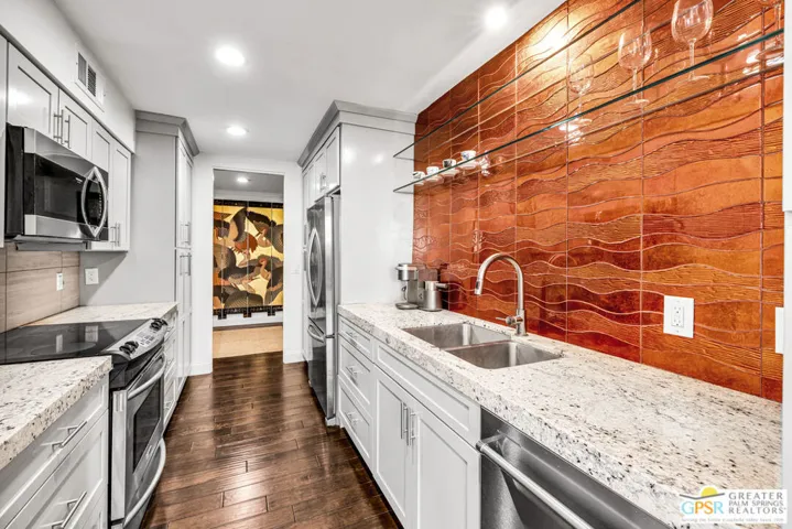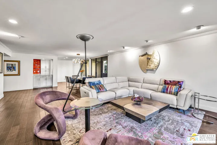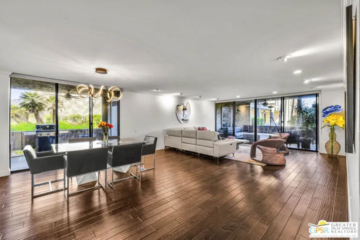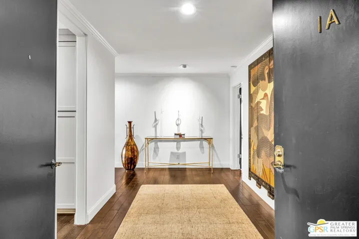 Welcome to the Diplomat, located in desirable South Palm Springs. Enjoy this 2-bedroom, 2 bath condo that has been updated to perfection. Upon entering through the double doors, you’ll find yourself in a grand foyer that sets the stage for this spacious first floor unit, both elegant and comfortable. The primary suite features a custom California walk-in closet and a luxurious bathroom with an oversized shower. The second bedroom has built-in cabinetry including a desk and a Murphy bed which provides flexibility for guests or a perfect home office. The kitchen adds to the beauty of the home with newer cabinets, appliances and new glass tile backsplash. The living room, dining room and both bedrooms open onto large covered balconies through floor to ceiling sliding glass doors and provide beautiful views of mountains, greenbelt and community pool. The outside space is perfect for dining, entertaining and expands the living space by approximately 400 sq ft. An additional standout feature is the privacy, as there are no shared walls with neighboring units. The building offers subterranean parking and an elevator conveniently close to the unit. The HOA includes cable, internet, water and trash, ensuring an easy, lock-up-and-go lifestyle or as a gracious full time residence. The Diplomat is conveniently located across the street from Smoke Tree Village providing access to markets, shops, pharmacy and restaurants all within walking distance. Move-in ready, renovated and beautifully designed, this Palm Springs home offers desert living at it’s finest.