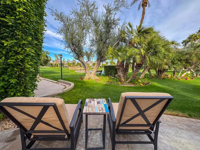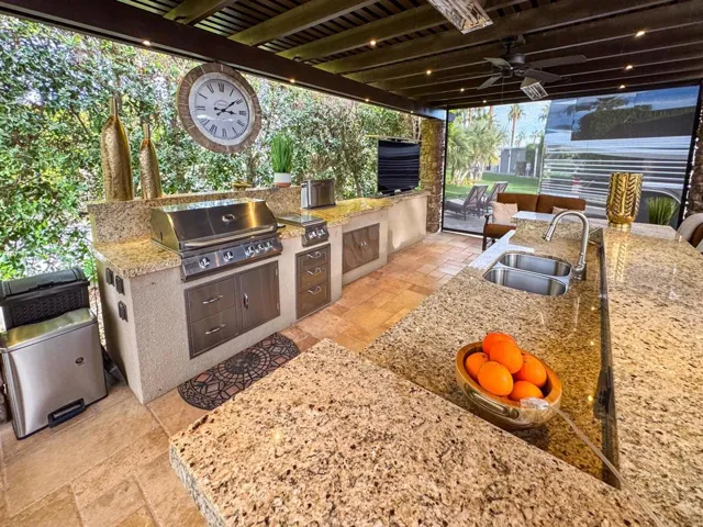 Outdoor Resort Indio is a Class A Motorcoach resort. This is an RV lot. This exceptional, oversized pie-shaped lot is one of the largest golf course properties in the resort. Perfectly situated behind the 6th tee box. The lot’s extra-wide frontage provides abundant parking for multiple vehicles, with the opportunity to expand further. Conveniently located directly across from the clubhouse, main pool, and pickleball courts, you’ll enjoy unparalleled access to the resort’s top amenities. As the sun sets, the beautifully lit landscape creates an inviting ambiance, making this lot an entertainer’s dream for hosting friends and neighbors.Designed for luxurious outdoor living, the lot features a beautifully upgraded kitchen with stainless steel appliances, granite countertops, a BBQ, large ice maker, refrigerator, double sinks, and a pop-up TV for entertaining. The spacious pergola with tiled flooring offers comfort and shade with electric drop-down screens on three sides, under-counter lighting, a ceiling fan, and two outdoor heaters for comfort. Thoughtful landscaping and paver accents create a welcoming and pet-friendly environment. With ample living space and the potential for a large casita, this lot provides the perfect blend of luxury, convenience, and privacy for the discerning RV owner. Plumbed and wired for a dishwasher.
