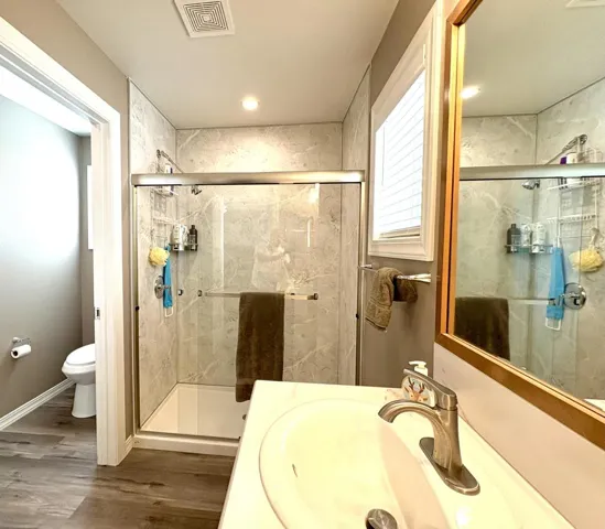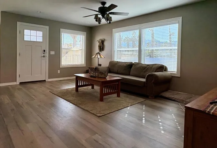 Experience modern desert living in this 2024 newly built 3-bedroom, 2-bath home, offering an open-concept layout and stunning mountain views. The expansive, newly fenced yard includes a walk-in storage shed, perfect for tools or extra space.Inside, luxury vinyl plank flooring enhances the main living areas, while plush carpeting adds comfort to the bedrooms. Enjoy year-round climate control with central A/C and heat. The spacious primary suite features a walk-in closet and a sleek walk-in shower.The gourmet kitchen shines with a large center island, Whirlpool stainless steel appliances, deluxe gas range, microwave hood, deep stainless steel sink, tile backsplash, shaker-style maple cabinetry, and a walk-in pantry. Additional highlights include dual-glazed Low-E windows, 3-inch wood blinds, and a full-size washer and dryer in the dedicated laundry room.Located in the vibrant Royal Palms 55+ community, residents enjoy a heated pool and spa, sauna, fitness center, pickleball, bocce ball, shuffleboard, mini golf, billiards, a library, and an activity-filled clubhouse. The gated, pet-friendly community also offers RV and off-street parking plus on-site management.Just minutes from downtown Palm Springs, this move-in-ready home offers comfort, convenience, and resort-style living.