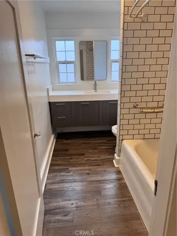 • Spacious bathroom with beautiful wall mounted vanity, subway tiles on the walls, tub with shower and curved shower rod;