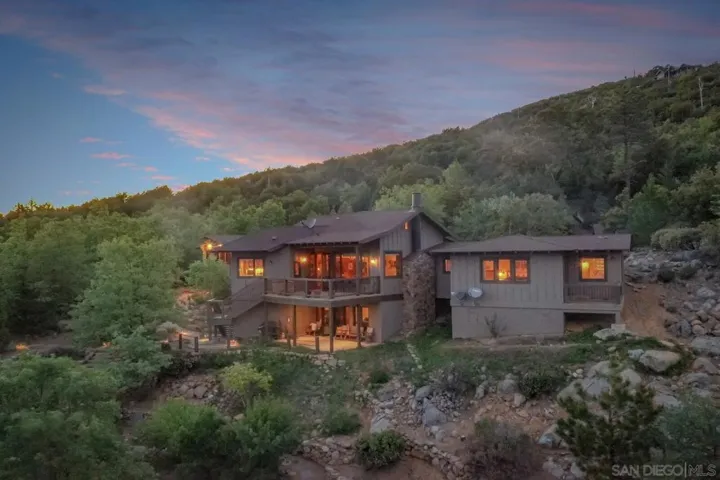 Set on just over twenty-five pristine acres, this private estate in the gated Cuyamaca Forest Ranch community offers spectacular, unobstructed views stretching from San Diego Bay and downtown San Diego to Mexico, El Centro, and the desert beyond. A rare luxury in this region, the property features a swimming pool, pool house, and spa—perfectly positioned to capture the surrounding natural beauty. A gated, private driveway leads to the main residence, a separate guest cottage, and a two-car garage. The main home showcases gorgeous exposed timber beams, extra-high ceilings, and interiors flooded with natural light. A striking natural-stone fireplace serves as a warm focal point for the living space, creating an inviting atmosphere year-round. Step out onto the expansive deck to take in the massive, ever-changing vistas—one of the property’s most remarkable features. The separate guest cottage includes a full bedroom, bathroom, and complete kitchen, ideal for extended stays, guests, or multi-generational living. Extensive walking trails wind throughout the acreage and culminate at a dramatic viewpoint with 270-degree panoramas and brilliant, star-filled night skies. Offering unmatched privacy, acreage, rare amenities, and breathtaking views, this is one of Julian’s most exceptional luxury properties.