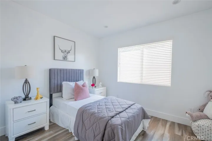 The front house features 2 bedrooms, 1.5 bathrooms, and 1028 square feet of living space. Highlights include a spacious recreation room, a beautifully designed kitchen with a quartz stone island, abundant cabinetry, and durable stainless steel appliances including a range stove and dishwasher. The living room boasts a charming fireplace, custom decorative moldings, and recessed LED lighting throughout. The bathrooms feature modern fixtures, a custom glass shower enclosure, and a sleek 60 inch wall mounted vanity. The front house is currently tenant occupied through August 31 2026.