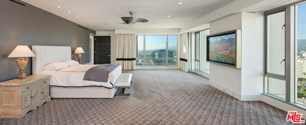 The penthouse at The Remington stands as a timeless statement of sophistication. An iconic residence where enduring style meets modern luxury. This exceptional two-story home captures the coveted northwest exposure, showcasing sweeping, world-class views that span Holmby Hills, UCLA, and the glittering Pacific Ocean. A direct-entry elevator sets an exclusive tone from the moment you arrive, complemented by a second interior elevator that effortlessly connects both levels of the home. Sunlight pours through expansive windows, illuminating every corner and framing dramatic vistas from nearly every room. Thoughtfully integrated smart-home technology enhances day-to-day living, offering seamless control and elevated convenience. An effortless blend of substantial single-family comfort with the ease of a refined pied–terre high above the city. Encompassing over 5,500 square feet, this penthouse offers the scale and presence of a private residence and ranks among the largest luxury units in Los Angeles. The grand primary suite features dual bathrooms and custom closets, accompanied on the upper level by a beautifully appointed guest suite. A third bedroom adjacent to the kitchen, along with a spacious first-floor office, creates an ideal layout for those accustomed to single-family living. Renowned as one of Los Angeles’ premier full-service buildings, The Remington offers world-class amenities including valet parking, a state-of-the-art fitness center, salon, pool, and an exceptional five-star staff dedicated to an effortless lifestyle.