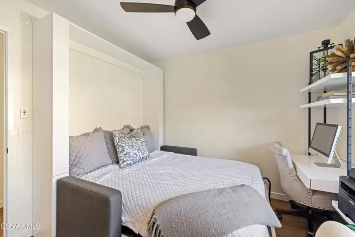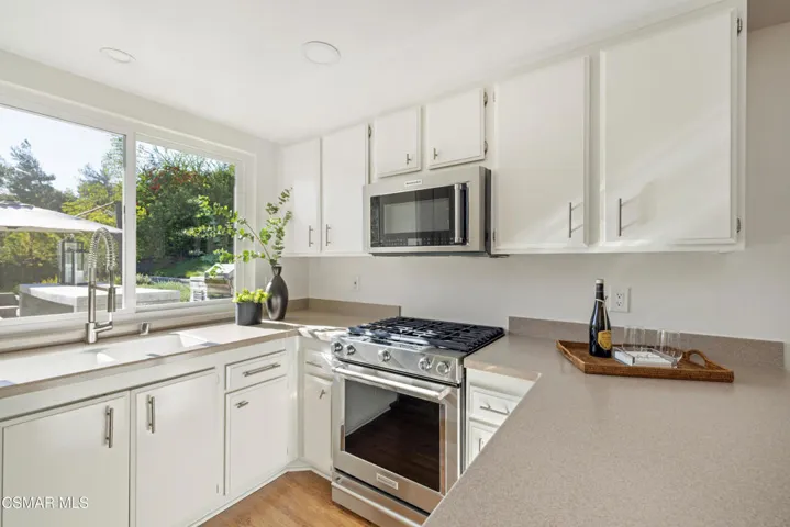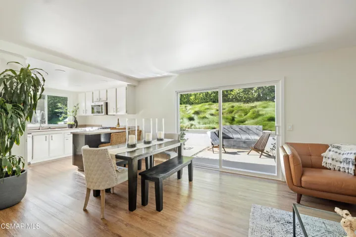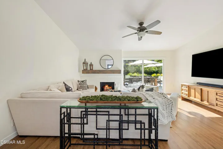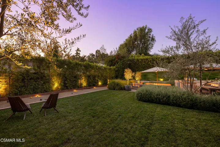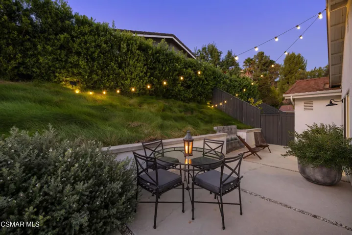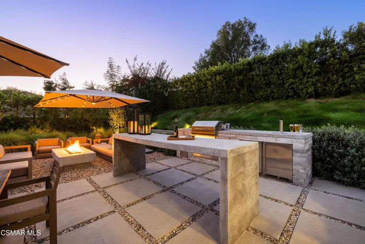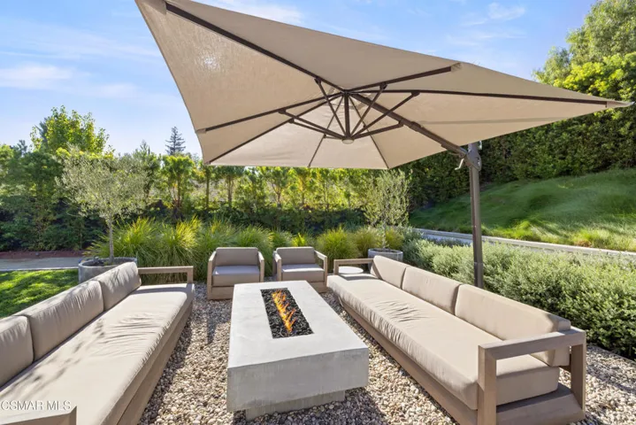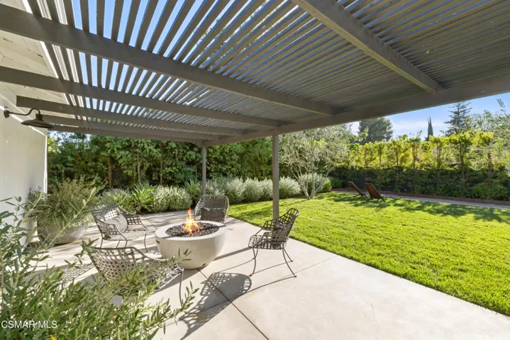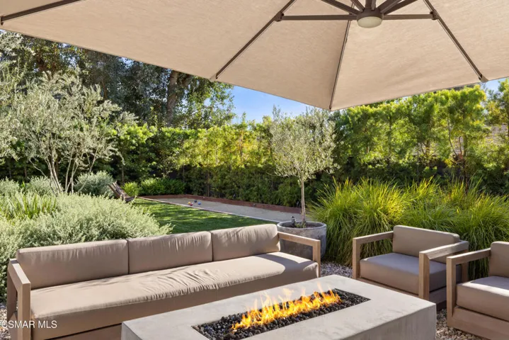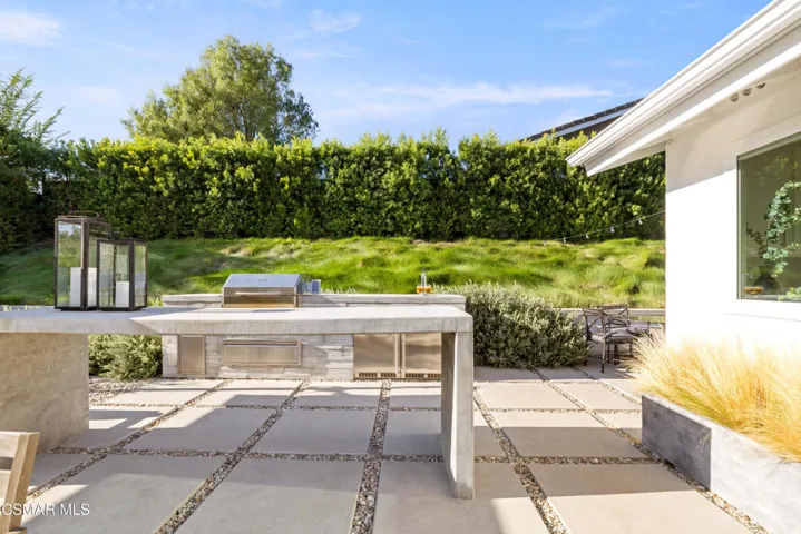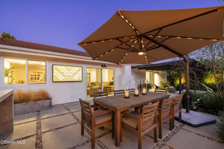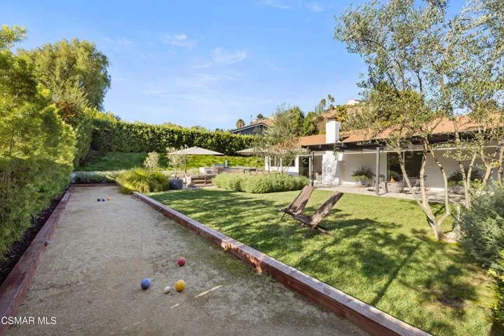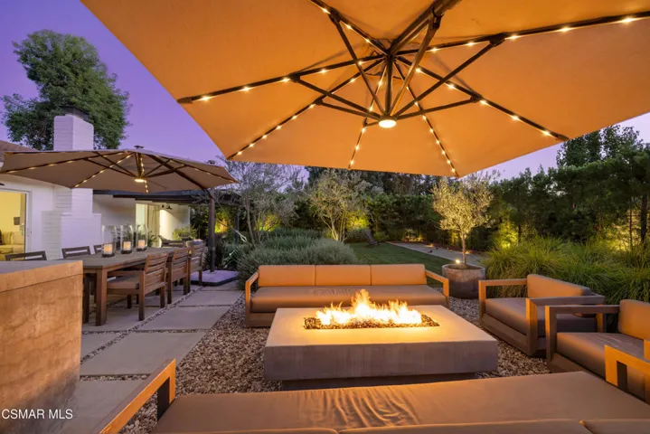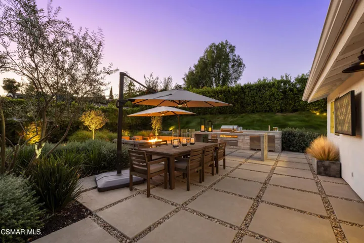 This stunning single-story residence showcases a newly redesigned exterior with exceptional hardscape and landscape features. The backyard is an entertainer’s dream, complete with a built-in BBQ, beer tap, dining table, and two firepits. A spacious grass area, bocce ball court, and a covered patio off the primary suite create the perfect blend of recreation and relaxation. Step inside through beautiful custom entry doors into a welcoming living room with a cozy fireplace, soaring vaulted ceilings, and seamless access to the backyard. The open-concept kitchen boasts newer appliances, an inviting eating area, and flows effortlessly into the family room. Just off the family room, a charming side yard offers a wall fountain and additional dining space, ideal for intimate gatherings. The primary suite is a private retreat featuring a walk-in closet, private bath, and sliding doors that open to the covered patio with its own firepit. 2 additional bedroom share the hall bath. Included in the front bedroom is a Murphy bed and built-in desk. Ideally located near schools, shopping and restaurants of charming Westlake Village.