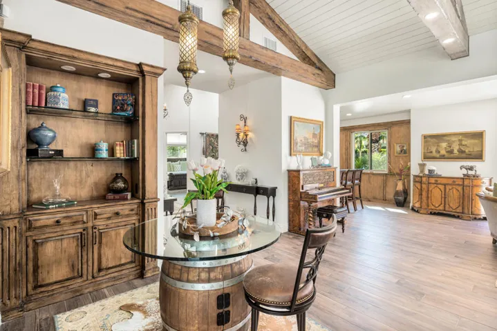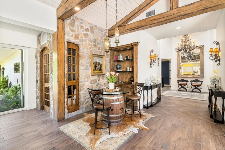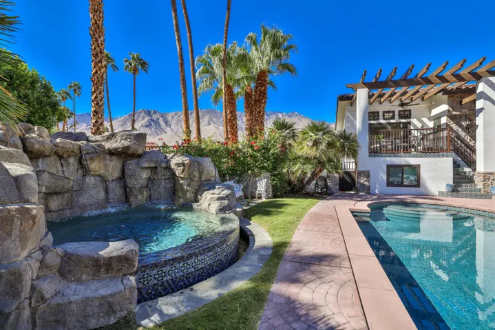 Casa Suenos – An Architectural Masterpiece in South Palm Springs. Tucked away in the exclusive enclave of Andreas Hills, Casa Suenos is a private sanctuary where timeless elegance meets elevated design. Surrounded by mountains, the estate is bathed in sunshine, sheltered from the wind, and framed by awe-inspiring 360 views. This remarkable location offers the ultimate setting for enjoying the Palm Springs lifestyle, just moments from world-class hiking, premier golf, and vibrant downtown dining and shopping. Reimagined and completely rebuilt just three years ago, this 5,417 sq. ft. custom estate is a meticulously curated Spanish Colonial masterpiece infused with romantic Moroccan and French influences. Every finish, texture, and detail has been intentionally selected to create a cohesive vision of escape, romance, and refined beauty. Designed as your own personal resort, the property features a sparkling pool with cascading waterfall, tranquil fountains, citrus gardens, and multiple lounge areas set against dramatic mountain vistas. Pocketing sliding doors create seamless indoor-outdoor living, opening to a spectacular front-loaded pool and spa, a Spanish-tiled outdoor fireplace, a fully equipped al fresco kitchen, and a raised patio that captures what may be the most breathtaking mountain views in the entire Coachella Valley. The estate offers 4 luxurious en suite bedrooms plus a fully appointed detached casita with its own kitchen, living room, and laundry, perfect for extended family, guests, or private retreats. Grand living spaces are anchored by soaring vaulted wood-beamed ceilings, artisan tilework, bespoke cabinetry, and a handcrafted dark wood tequila bar–hallmarks of true craftsmanship. Blending elegance with comfort, the primary suite offers a romantic escape infused with warmth and style, complete with a spa-like bath, dual walk-in closets, and a private office for quiet retreat or stylish remote work. Each guest suite has been thoughtfully designed with en suite baths and elevated finishes to welcome visitors with the most refined taste. Casa Suenos is more than a residence, it’s a timeless expression of romance and elegance, seamlessly intertwined with the sophistication of Palm Springs living. Welcome home to Casa Suenos.
