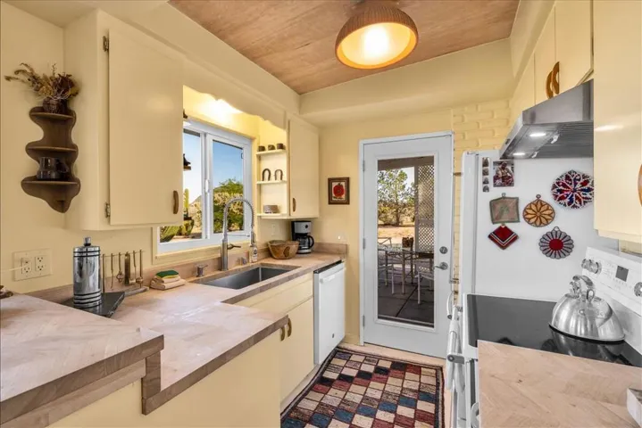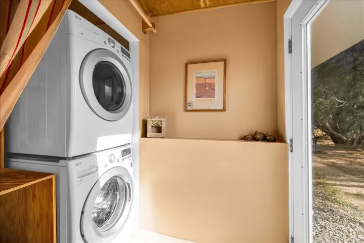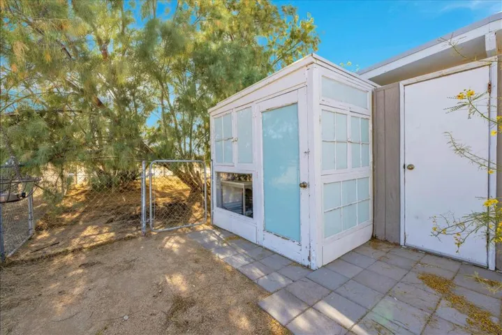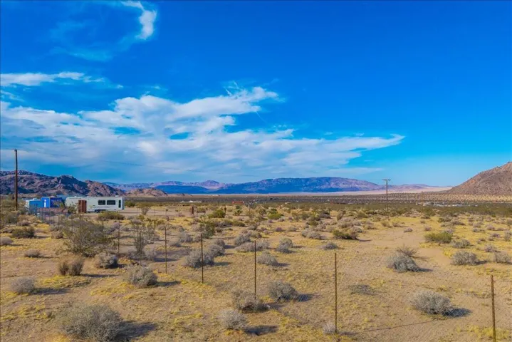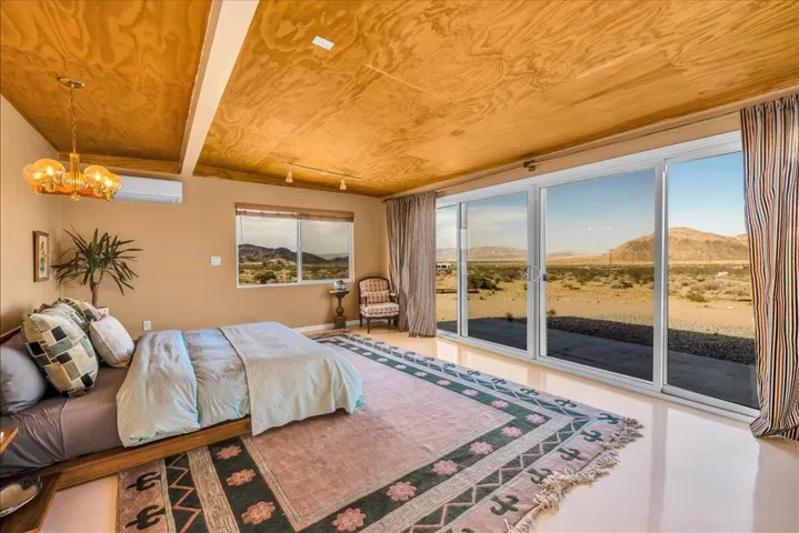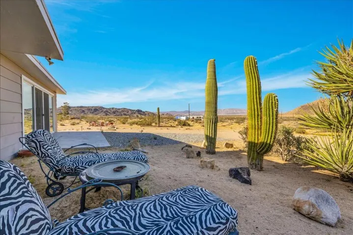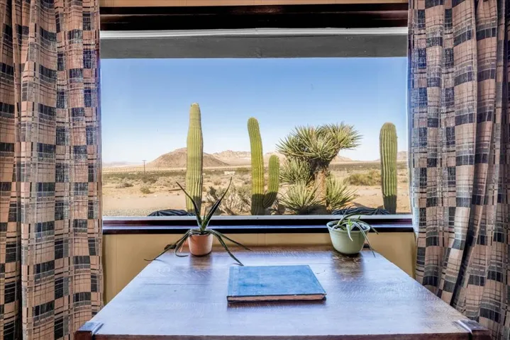 Unobstructed mountain views in every direction. This is the perfect blend of mid-century style and modern desert living in this beautifully updated 3-bedroom, 2-bath high desert retreat. Set in a serene and scenic location near Goat Mountain and the iconic Integratron sound bath, this home offers comfort, character and incredible natural surroundings. Complete renovation includes butcher block kitchen countertops, custom cabinetry, newer top-of-the-line appliances, smooth finished epoxy floors along with all new energy efficient dual pane windows and doors. Natural light , open floor plan and vaulted custom wood ceilings. Extra large primary bedroom suite with stunning bathroom and separate laundry closet. All bedrooms and living room offer split AC units for individual room temperature control. Outside you’ll find an amazing mature cactus garden, firepit, horse shoe pit and separate small guest room, office or art/music room. Home is shaded by mature Tamarisk trees to the West. Private hot tub for relaxing under the stars. 5 acre lot with 2.5 acres completely fenced, gives the feeling of being off the grid with all the luxuries of utilities in place and hidden from views. Yucca Valley, Joshua Tree Park, Pappy & Harriet’s, Integratron, La Copine restaurant are all close by.