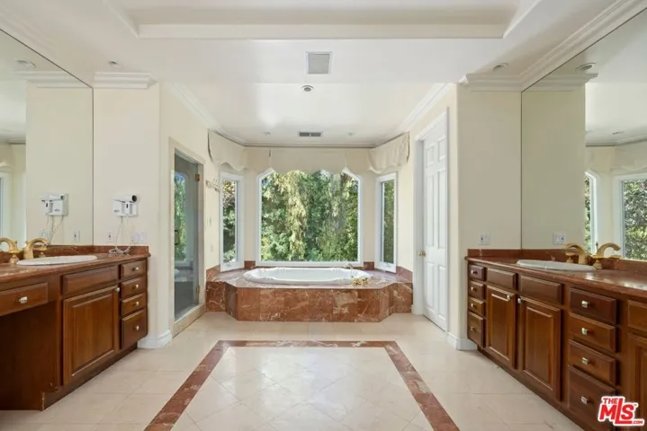 Stunning gated estate located South of the Blvd on prestigious Vanalden Ave. This private and stately home offers soaring vaulted ceilings, dramatic dark wood floors, and an open layout ideal for entertaining. The grand living room features floor-to-ceiling windows creating an abundance of natural light with views of lush greenery and a sparkling saltwater pool. A dramatic second-floor mezzanine overlooks the spacious living room, adding architectural elegance and a sense of grandeur. The home includes a formal dining room, cozy den with fireplace next to the kitchen, and a separate sitting or game room off of the living room. The chef’s kitchen boasts high-quality Imperial appliances, a built-in refrigerator, stone counters, center island, and a breakfast nook with French doors leading to a resort-style yard. The backyard oasis includes a heated pool and spa, built-in BBQ, gazebo, fire pit, and child safety gate. The first floor has two bedrooms, offering an ideal spot for an office. The second floor features four large bedrooms, including a luxurious primary suite with dual walk-in closets, a spa-style bath with steam shower, jetted tub, and marble finishes. One bedroom serves as a home theater with balcony access completing the upper level. This is a unique opportunity to own a beautifully designed residence in one of the most sought after areas in Tarzana.