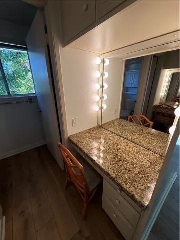 This turnkey home features 2 bedrooms and 2 baths, fresh interior paint, and a remodeled kitchen with an arched pass-through to the living room, granite countertops, newer cabinetry, vinyl flooring, recessed lighting, and a large skylight that fills the space with natural light.