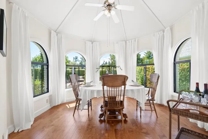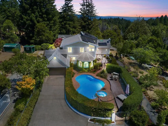 Discover Stillpoint, where a former Zen retreat center, soaked in sunlight, becomes your own everyday escape. Set behind a gated entry, this one of a kind 2.5 acre estate is a private haven of peace and beauty. This versatile property offers several structures and residences.The 4BR/3.5BA 3,819 square foot main home is full of natural light. The kitchen and primary bathroom are updated with timeless finishes. The home feels warm and welcoming with hardwood/ bamboo floors, and a wood stove. Soak up the sun on one of several expansive decks. A permitted 2BR/1BA 902 square foot ADU sits above the 3-car garage, complemented by a detached 330 square foot studio guest house and a flex space/office with half bath off the primary suite balcony. Enjoy a private saltwater pool and spa with solar and propane heating, a full-home backup generator, 14kW owned solar, and high-speed internet. Landscaped grounds include gardens, orchards, patios, and trail access to Fall Creek State Park. With an RV hookup, potential pickleball court, fenced perimeter, and multiple living spaces, Stillpoint is a rare blend of functionality and restorative calm, where the name truly reflects the experience.