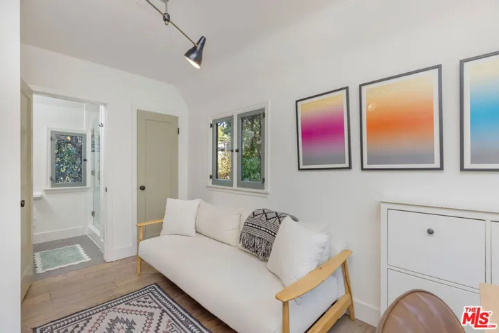 Tucked behind a gated drive, this Hollywood Hills haven welcomes you with sweeping vistas out of nearly every window. Enter the home past a tranquil water feature into a light-filled living room, complimented by vaulted ceilings and three sets of French doors, creating beautiful indoor-outdoor flow. Off the main living space sits an open-concept dining area and adjacent contemporary kitchen, complete with painted green cabinetry. Beyond the kitchen, on the main level, is a versatile guest suite – ideal as an office or creative studio – with its own en suite bath. As you descend to the lower level, a secondary living room makes the perfect space for lounging. Find two spacious bedrooms on either side of that flexible living area, each with its own bathroom. Outside, a spiral staircase leads to an elevated patio and fire pit – an intimate perch for evening gatherings set against the backdrop of the surrounding hills. Multiple terraces and sitting areas are enveloped by mature landscaping, creating an unparalleled sense of serenity. Enjoy the rare blend of character and modern comfort presented by this 1924 home, with its iconic views and effortless connection to the best of the Hollywood Hills, including the amenities of Franklin Village and the nature of Griffith Park, all just minutes away. Available for lease beginning January 10th, 2026.