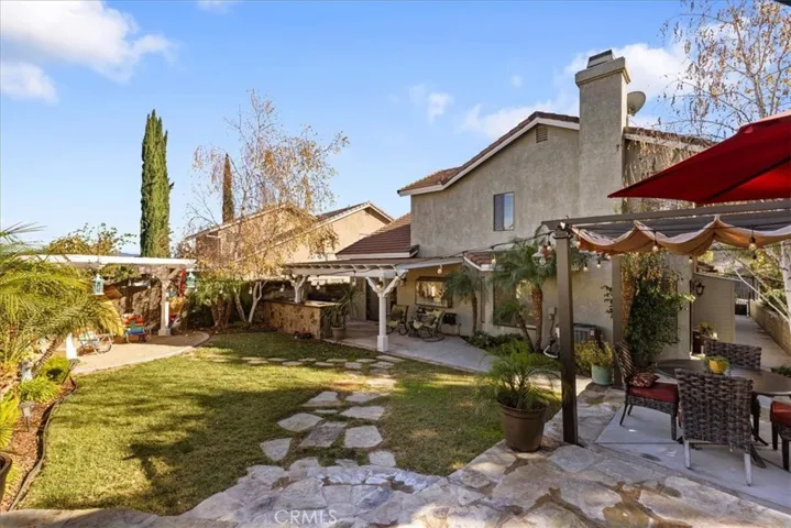 Welcome to this beautifully maintained Bravo home in Castaic! Located at the end of a cul-de-sac, this immaculate 3-bedroom home—with a versatile bonus room and 3 bathrooms—offers both comfort and style. Enjoy mountain views from the inviting front porch, then step inside to a flowing layout that includes a formal living room, dining room, and a cozy family room with a fireplace. The adjacent kitchen features updated granite countertops, refreshed cabinetry, and stainless steel appliances, including a gas range, microwave, dishwasher, and trash compactor. A downstairs bonus room provides the perfect flex space for an office, guest room, playroom, or gym. The first floor is enhanced by attractive wood-like laminate flooring. Upstairs, the primary suite includes an updated bathroom with dual sinks and a soaking tub with shower. Two additional bedrooms share a convenient Jack-and-Jill bathroom. The backyard is designed for entertaining, with a covered patio and built-in bar top, plus an elevated hardscaped deck ideal for al fresco dining. The landscaped side hill adds beauty and privacy—especially vibrant in the spring. Additional highlights include a garage with extensive built-in cabinetry and a dedicated work area. Conveniently located near schools, shopping, and freeway access, this home has been lovingly cared for by its sellers. No HOA or Mello-Roos! A MUST SEE!